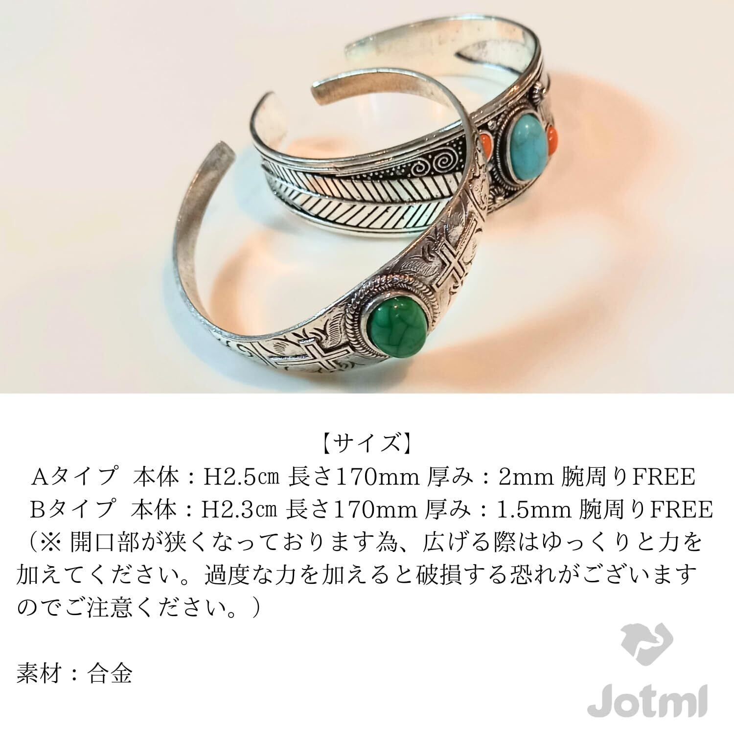 【デザイン】typeA:ターコイズとリーフ柄のボヘミアンデザインが、腕もとに色気とアクセントを足してくれます!これ一つだけで存在感があり、シンプルでラフな服装にもぴったりです。typeB:ターコイズとクロスのボヘミアンデザイン。