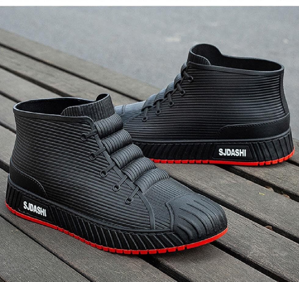 スニーカー風の型押しデザインのメンズレインシューズPVC素材で防水効果が抜群ですかかとにストラップ付で脱ぎ履きも楽ちんです