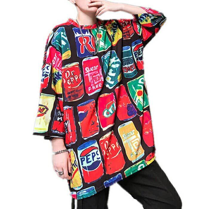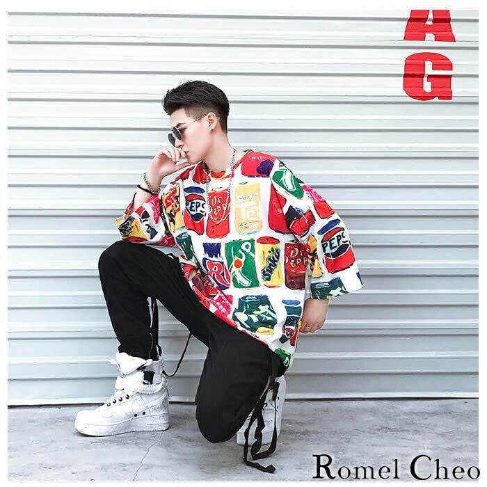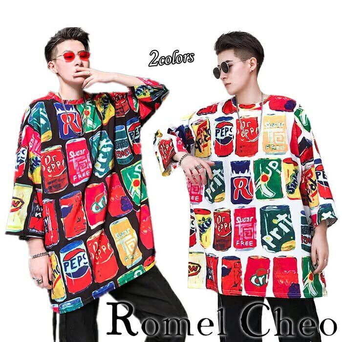 [RomelCheo] イラスト プリント tシャツ カラフル 派手 個性的 5分袖 7分袖 ビッグシルエット ドロップショルダー 半袖 ロング丈 メンズ 原宿風 ストリート