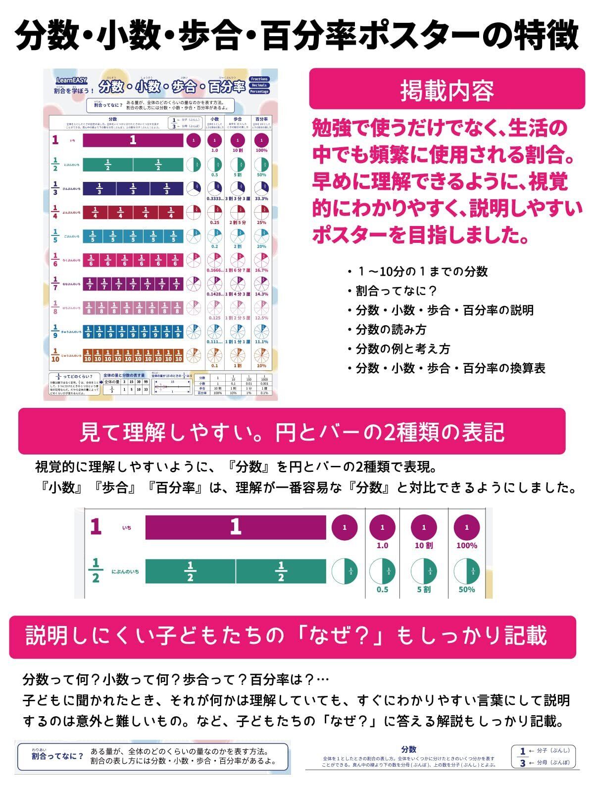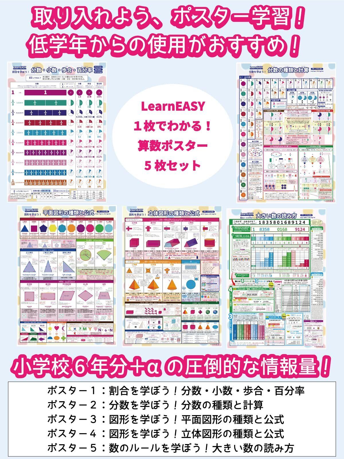 【在庫処分】LearnEASY 小学生 1枚でわかる 算数ポスター 5枚セット 割合 分数の計算 平面図形 立体図形 大きい数 中学受験 大きい A2サイズ プチバイリンガル (1 2 3 4 5)