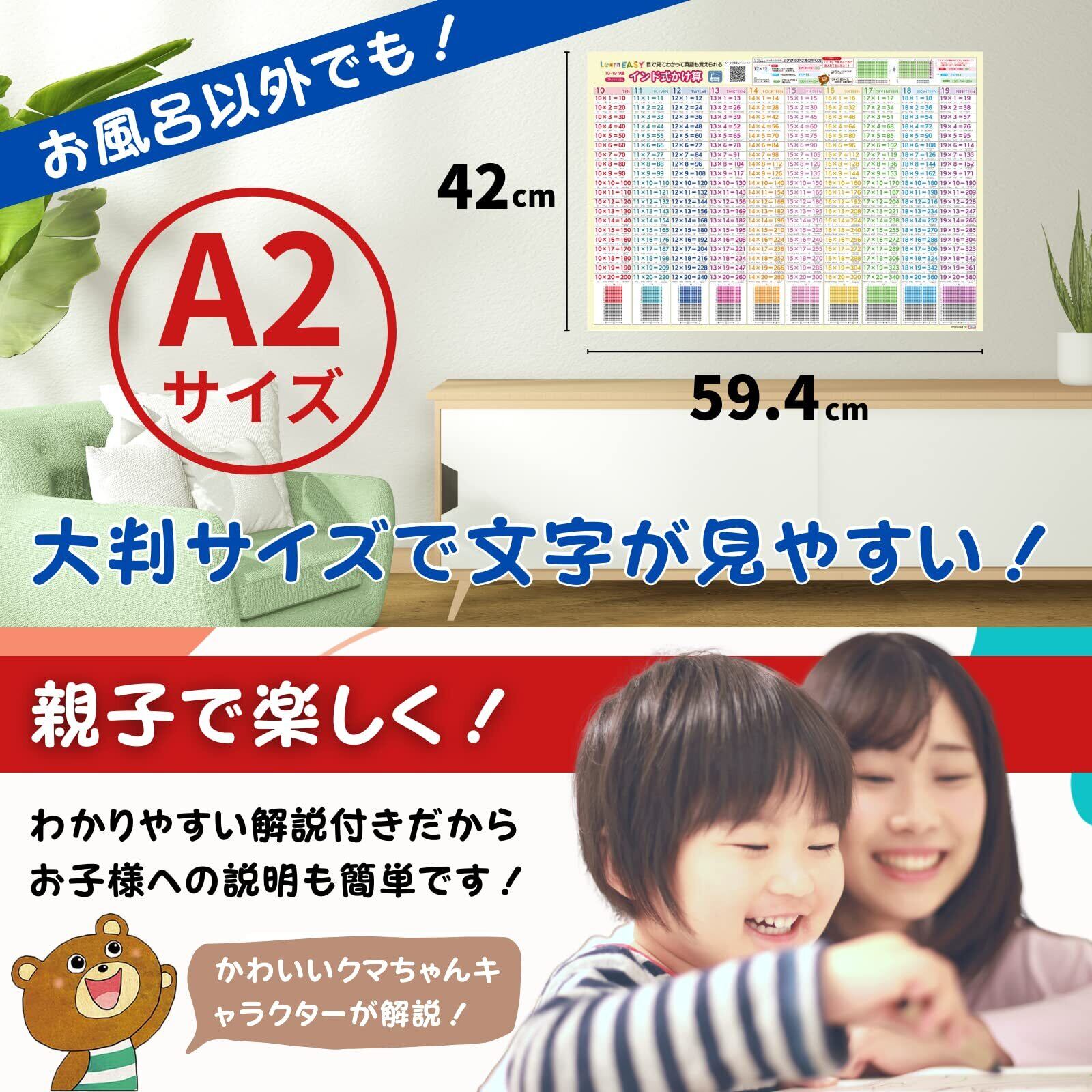LearnEASY 目で見てわかって英語も覚えられる インド式かけ算 お風呂用ポスター 音声QRコード 10の段〜19の段 大きい A2サイズ 小学生 学習 算数ポスター
