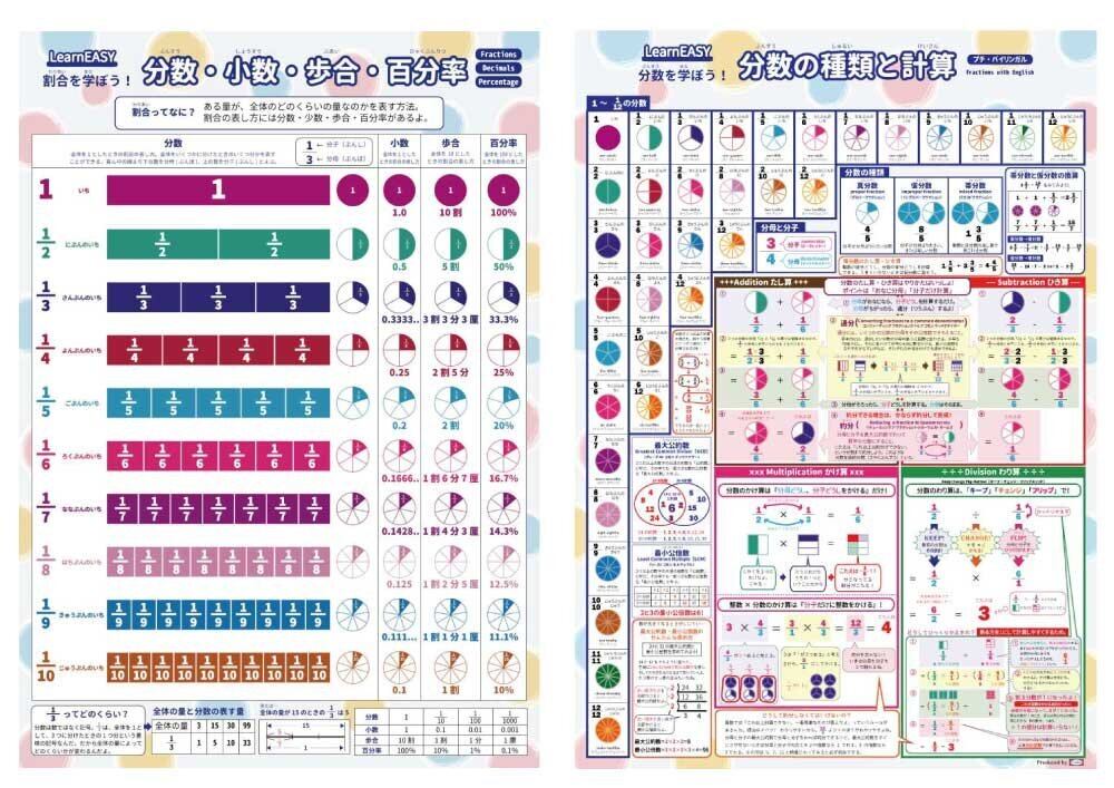 LearnEASY 小学生 1枚でわかる 算数ポスター 2枚セット 分数の計算 小数 歩合 百分率 英語併記 公式 一覧 中学受験 大きい A2サイズ プチバイリンガル (1 2)