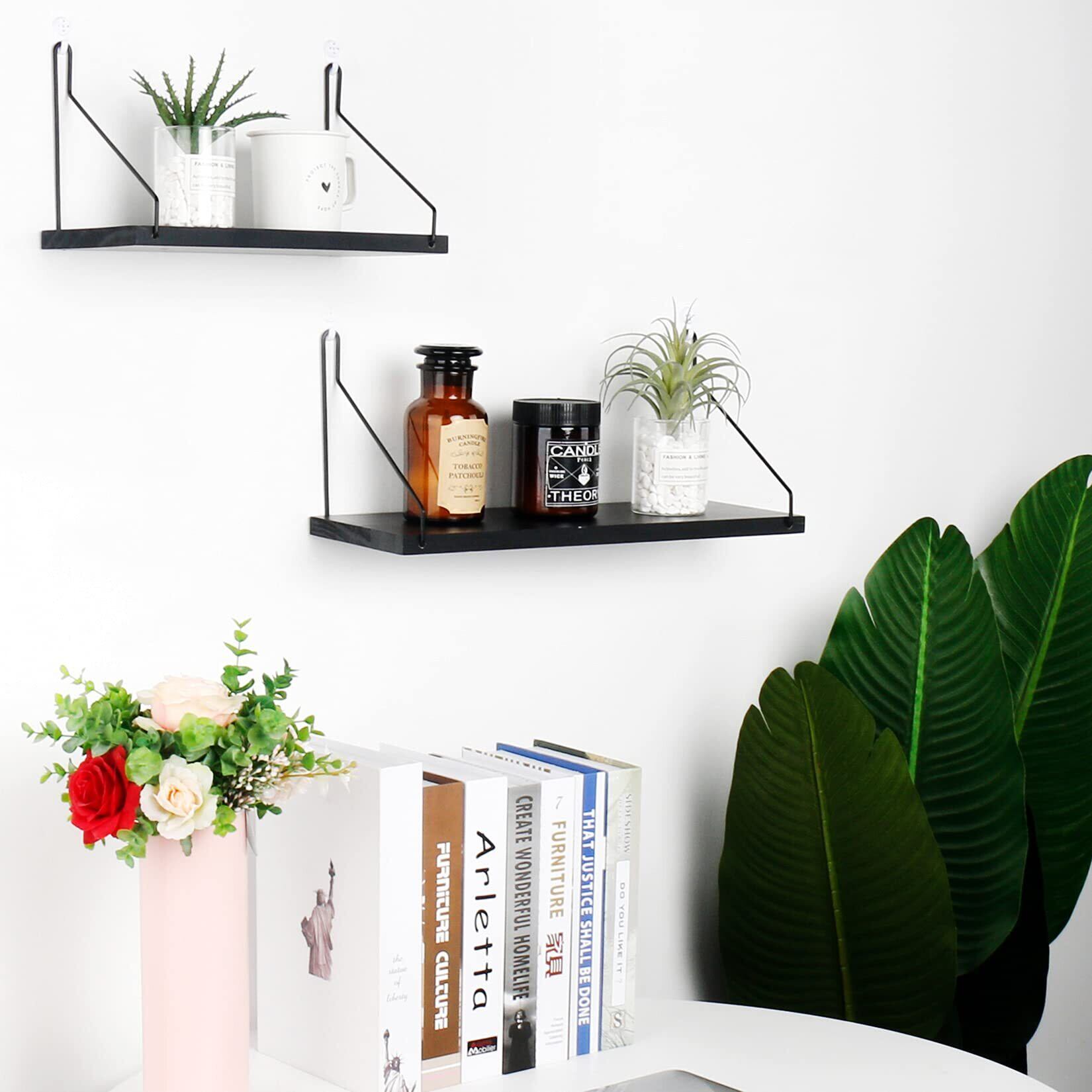 ウォールシェルフ 天然木 壁掛け棚 鉄製 ワイヤー壁棚 賃貸 飾り棚 壁面収納 無痕釘 ネジ 木製 (ブラック, 50cm)