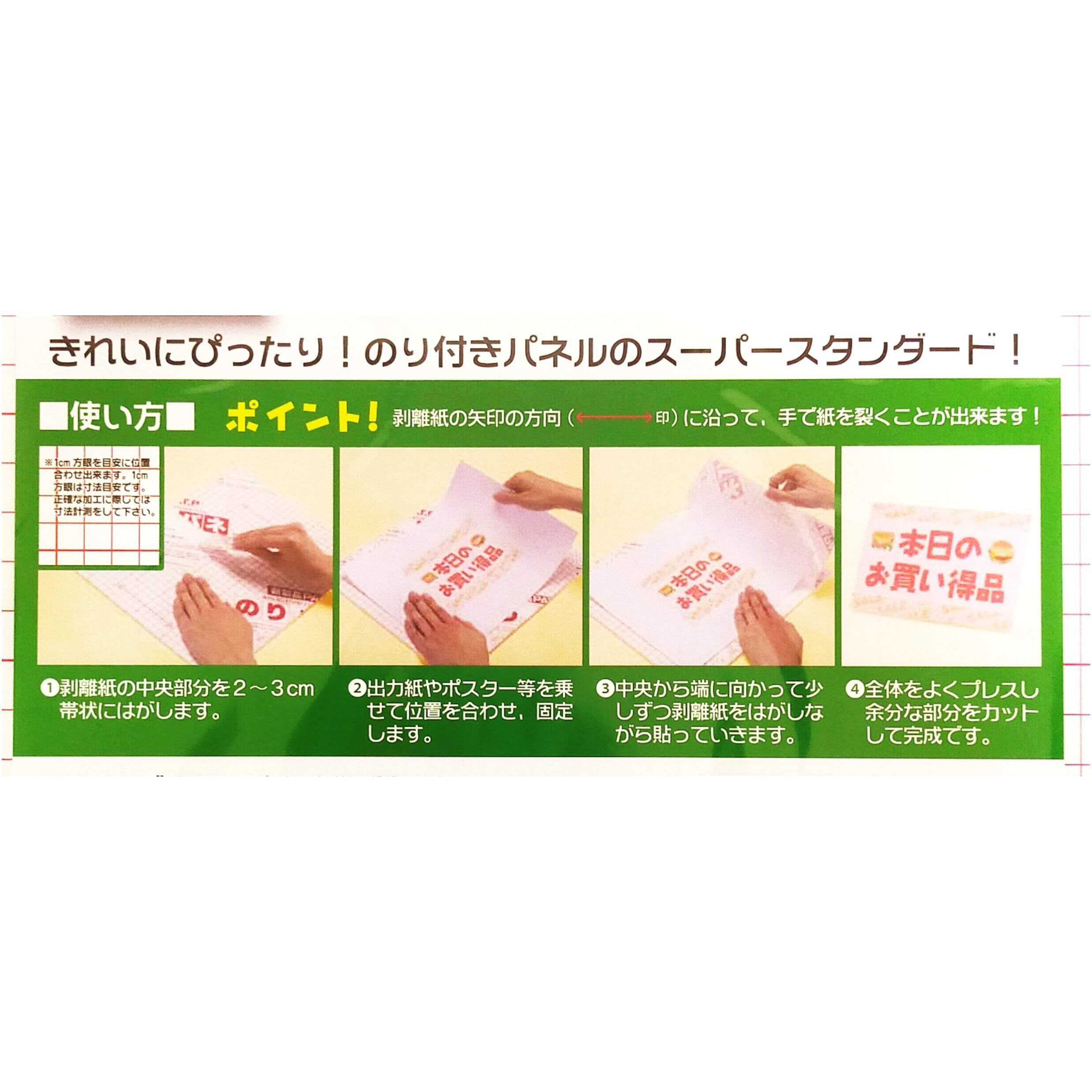 片面貼りです。剥離紙を剥がし、写真、ポップやポスター等を貼り付けるだけで簡単にディスプレイ出来ます。