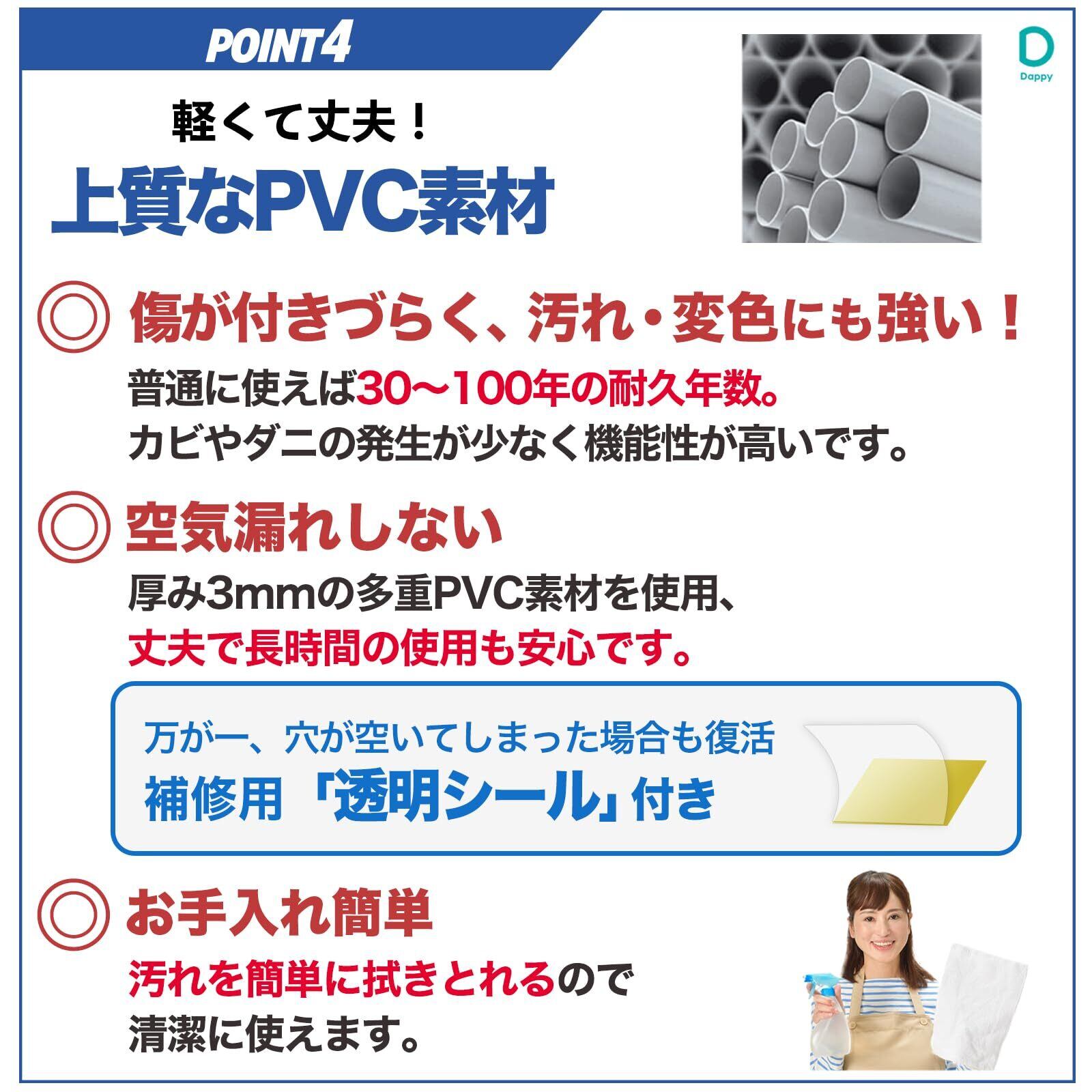 【空気漏れ・水漏れしない】従来のPVC素材をより強く、更に厚く改良しました。そのため耐衝撃性に優れ、丈夫で長時間の使用もできて安心です。※必要に応じて、1週間に一度は空気の注入をおすすめします。
