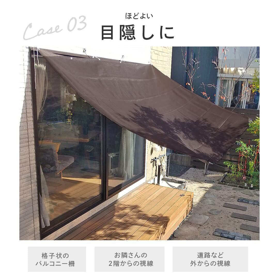サイズ(約):100*360/100*500/80*500/100*600/180*180/200*300 重量:サイズ、カラーごと異なりま 材質 生地:ポリエチレン ハトメ:アルミ 遮光率:約80% 付属品:取り付け紐 150cm×4本、結束バンド 内周20cm×18本 ・通気タイプではありますが、台風などの強風時は外してください。建物を破損したり、事故につながるおそれがあります。 ・本体を過度の力で引っ張らないで下さい。破損の原因になります。 ・本体は日除け、目隠しを主な目的としていますので防雨としてのご使用はお避け下さい。 ・本体は必ず同梱されている取付用ヒモで確実に固定してからご使用下さい。 ・折り目あとが残りますが品質には問題はありませんので、あらかじめご了承ください。