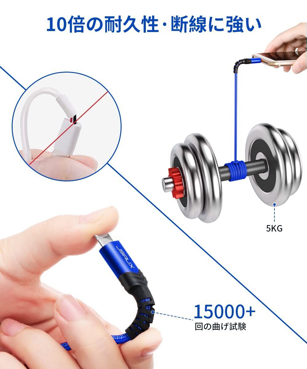 【便利なデザイン】1.8mのiPhone ケーブル、電源から離れても自由に充電可能 、届きにくいUSBポートや遠い場所にある充電器にも快適に接続できます。また、付属便利な収纳ベルト、用途に応じて、ケーブルの長さを簡単に調節可能、持ち運びも楽です。このiPhone充電ケーブルは内部には軍事レベル特別な材料を使用、外装には丈夫なナイロン素材を使用し、折り曲げ耐えデザインで、万回以上のケーブルの折り曲げテストに合格しており、一般のケーブルより30倍の強さがあります。