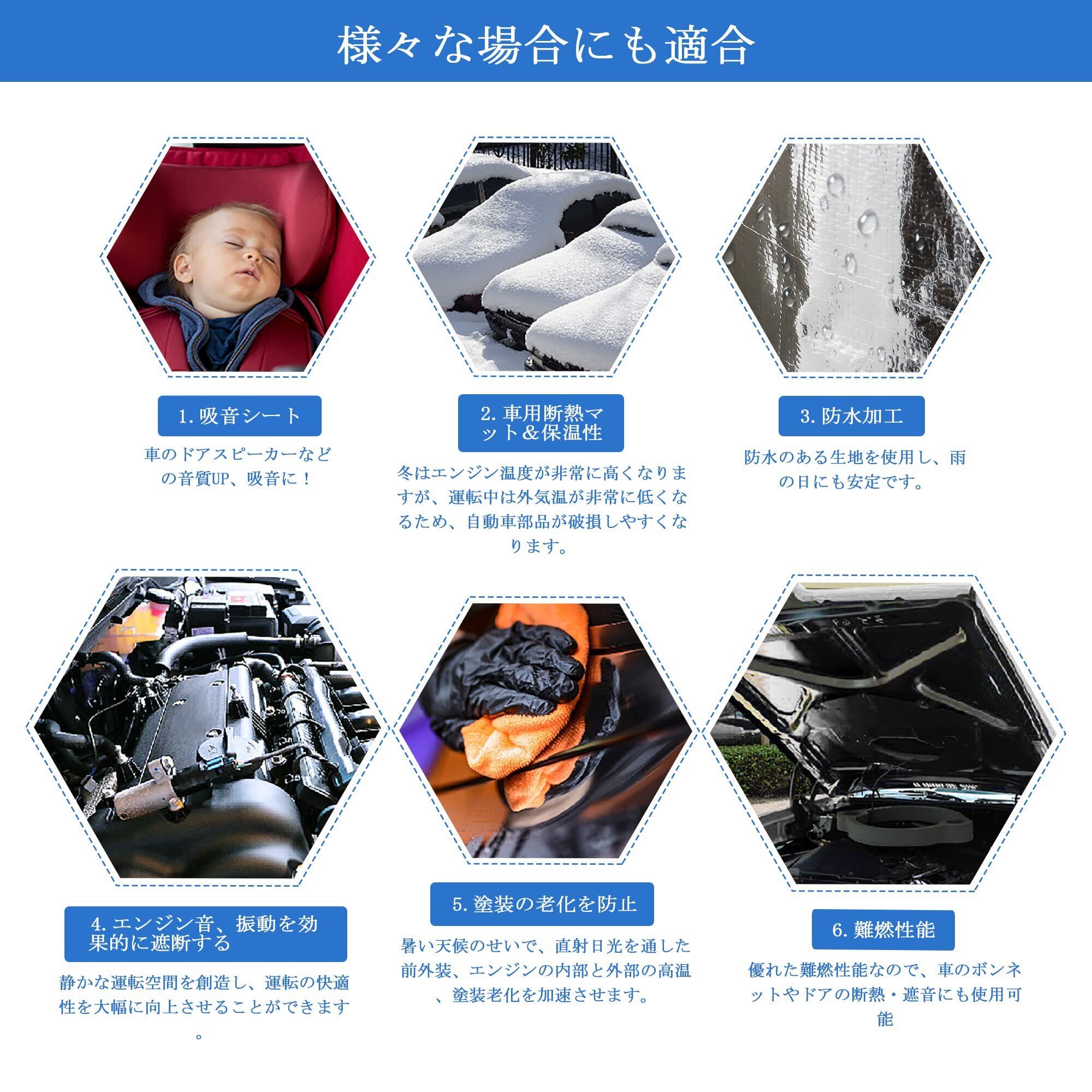 [断熱] 使用される材料は優れた断熱材です!断熱マットは寒さと熱の両方に対処することができます。この製品は熱帯気候地域で特に重要です。充分に断熱されたインテリアは車両に乗っている間の高い快適性の約束です。 あなたの車に強力なエンジンが装備されている場合ライナーの熱シールド材料は、過度の加熱の問題を解決します。 また、フード断熱材(フードライナー)としてライナーを使用するのも簡単です。
