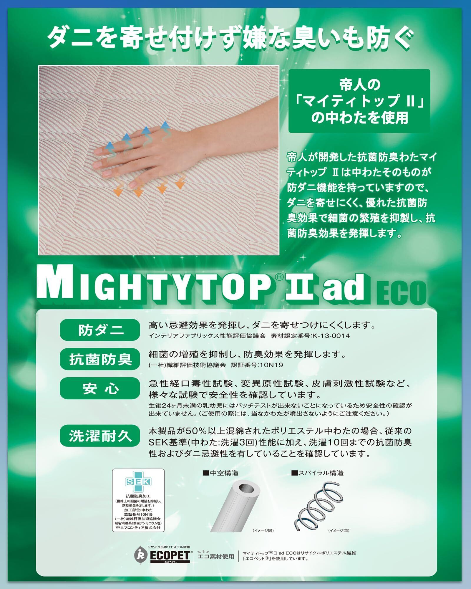 【抗菌防臭で清潔な睡眠】抗菌・防臭帝人の【マイティトップⅡ】中わたが織り成すベットパット。抗菌・防臭処理が施され、菌の増殖、汗や加齢臭など嫌なニオイを抑えます。帝人が開発した中わた【マイティトップⅡ】は防ダニ機能を備え、ダニを寄せ付けず、清潔で快適な睡眠環境をお約束します。美しい夢の中で、心地よい香りと共に、至福の眠りへ誘います。日々の疲れを癒し、優雅で幸せな眠りを手に入れましょう。