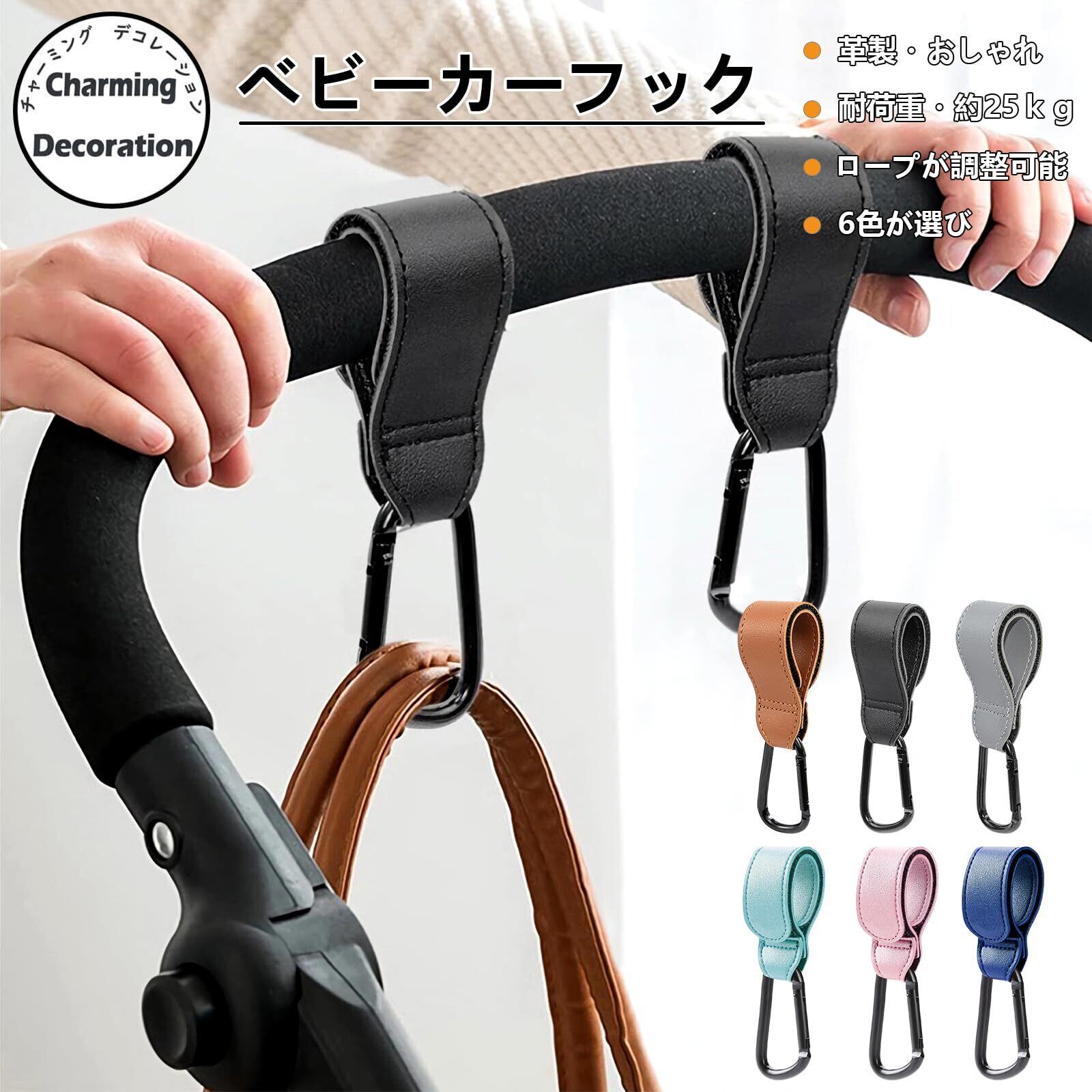 【Charming Decoration】ベビーカー フック カラビナ バギーフック 合皮 PUレザー製 2個コンビ ベビーカー荷物掛けフック 耐荷重約25kg マジックテープ式 調節可能 軽量 丈夫 ベビーカー/バギー/自転車に適用フック (グレー)