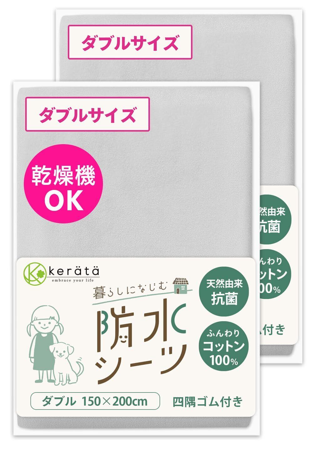 (ケラッタ) 防水シーツ おねしょシーツ 丸洗い&乾燥機OK 綿100% 抗菌 防ダニ シート ベビーシーツ [n グレー×グレー (2枚セット)ダブル 150×200cm]