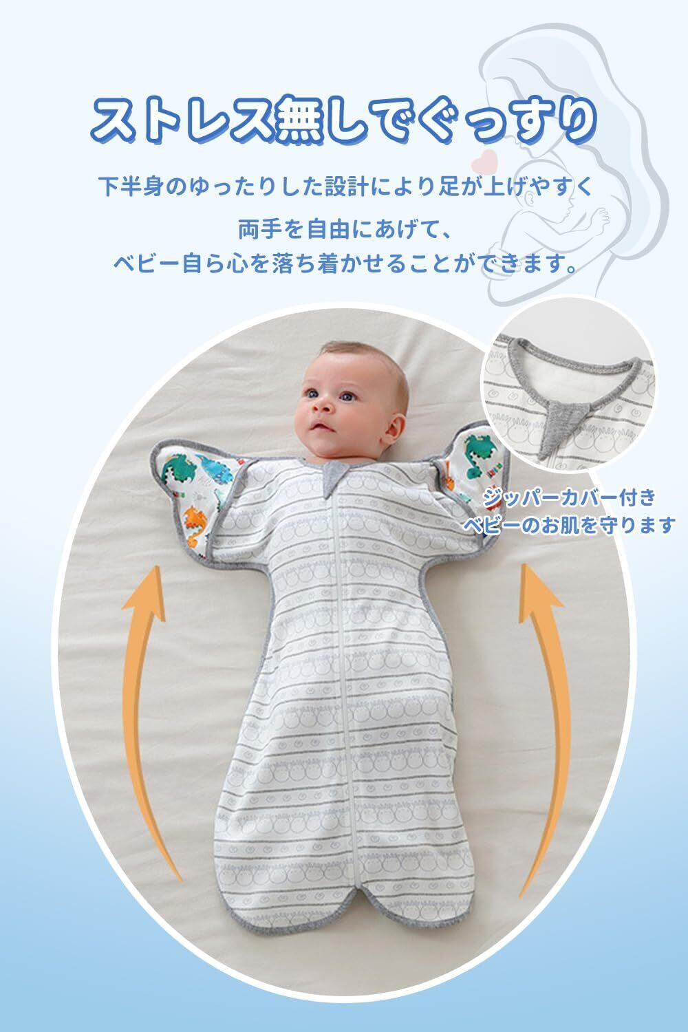 【ストレス無しでぐっすり】 両手を自由にあげて、ベビー自ら心を落ち着かせることができます。 下半身のゆったりした設計により足が上げやすく、お腹にいたときの姿勢が自然に作れる。ベビーの股関节の発育サポートする。