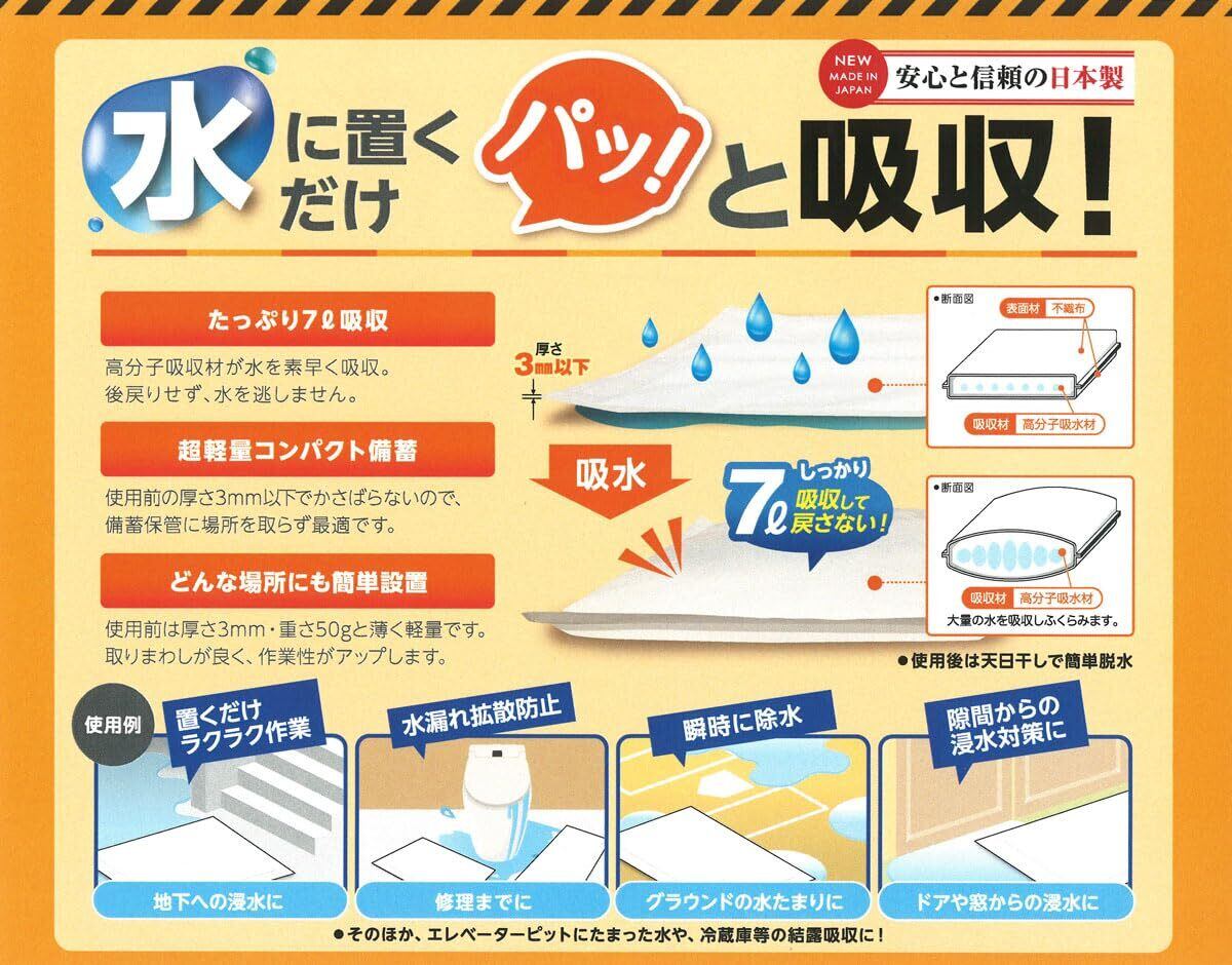 (商品説明) 1.置くだけで水をすばやく吸収! 地下への浸水、天井からの漏水、エントランスやグラウンドの水たまり等に、置くだけで水を素早く吸い取ります。 約5分で最大7Lの水を吸収します。 2.コンパクトに保管可能!備蓄に最適! 1袋サイズ(10枚入)が約 幅395×奥行325×高さ17mmと コンパクト。企業様や学校様、自治体様の備蓄に最適です。 急な大雨や台風の雨漏り・水漏れの備えに! (注意事項) ◆止水材としての使用、「油・溶剤・海水」等の吸水は できません。 ◆吸水後の再利用はできません。 ◆使用後は1周間程度の天日干し、もしくは脱水剤を使用 しての排水後、地域の規則に従って廃棄してください。