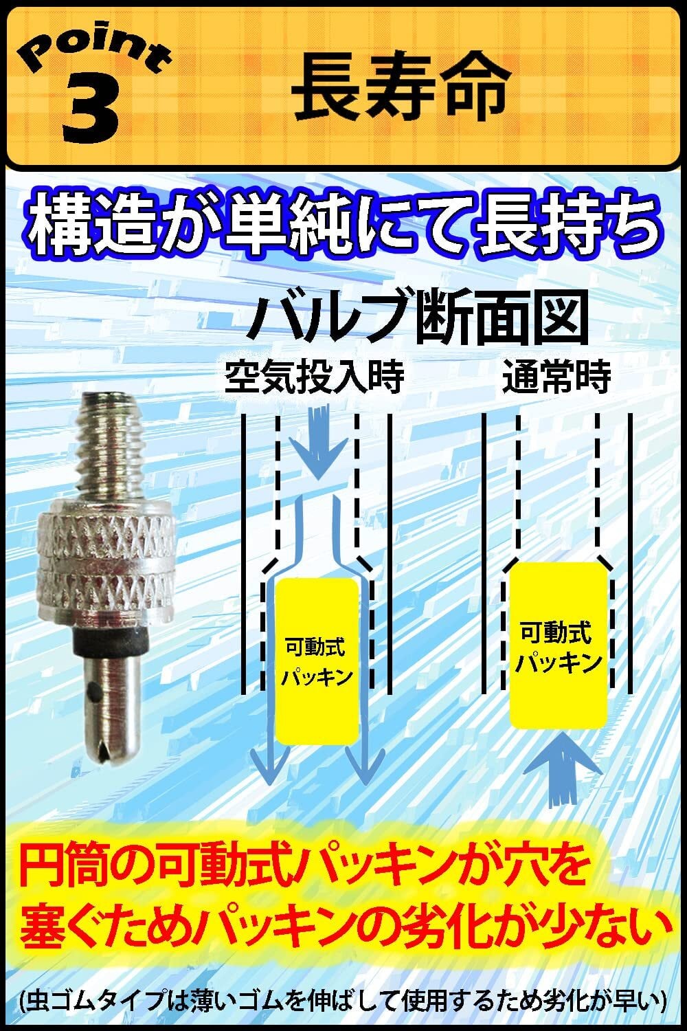 【空気入れが楽】バルブ内部のパッキンが動くため、空気入れに力が要らず、楽に空気入れができます。