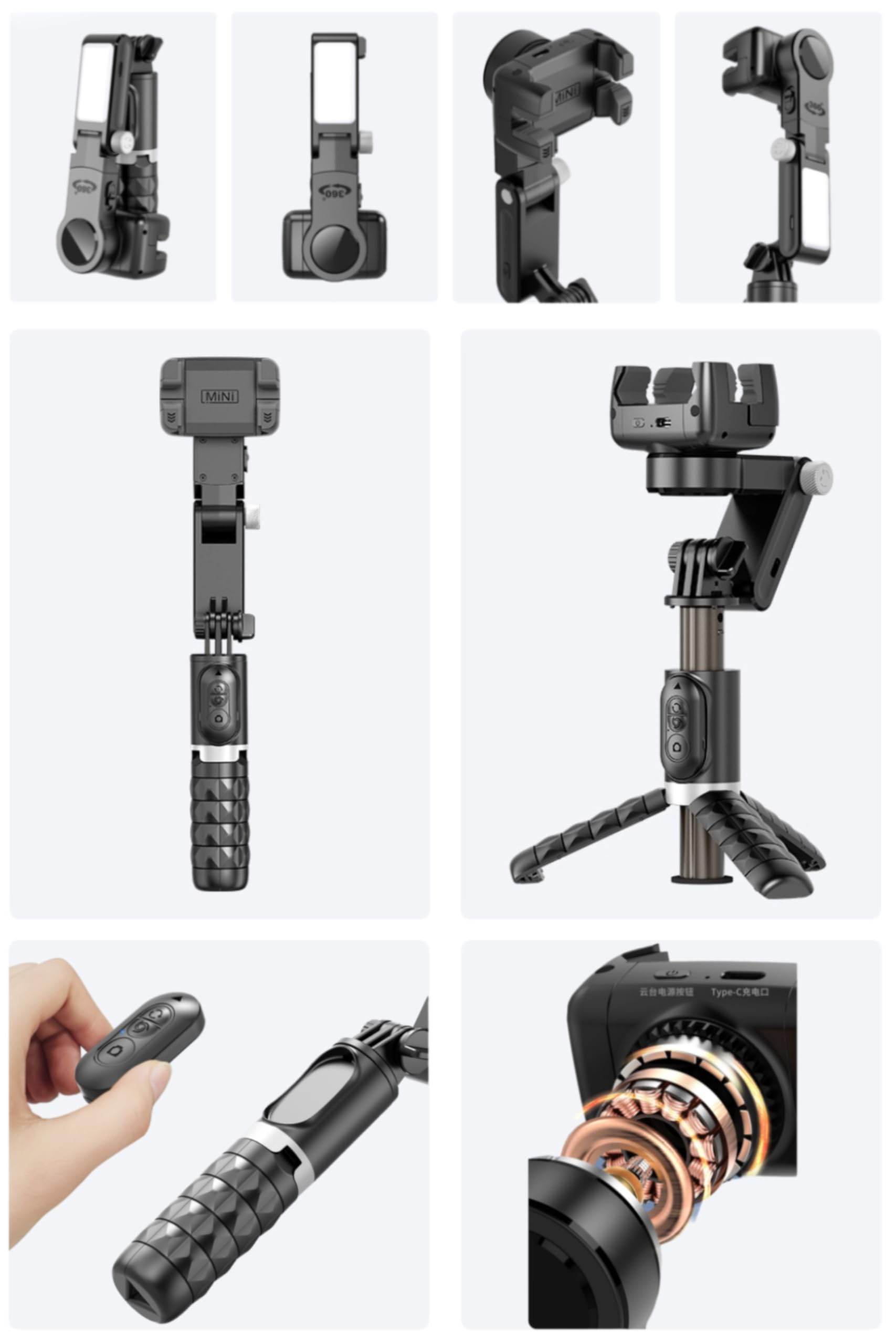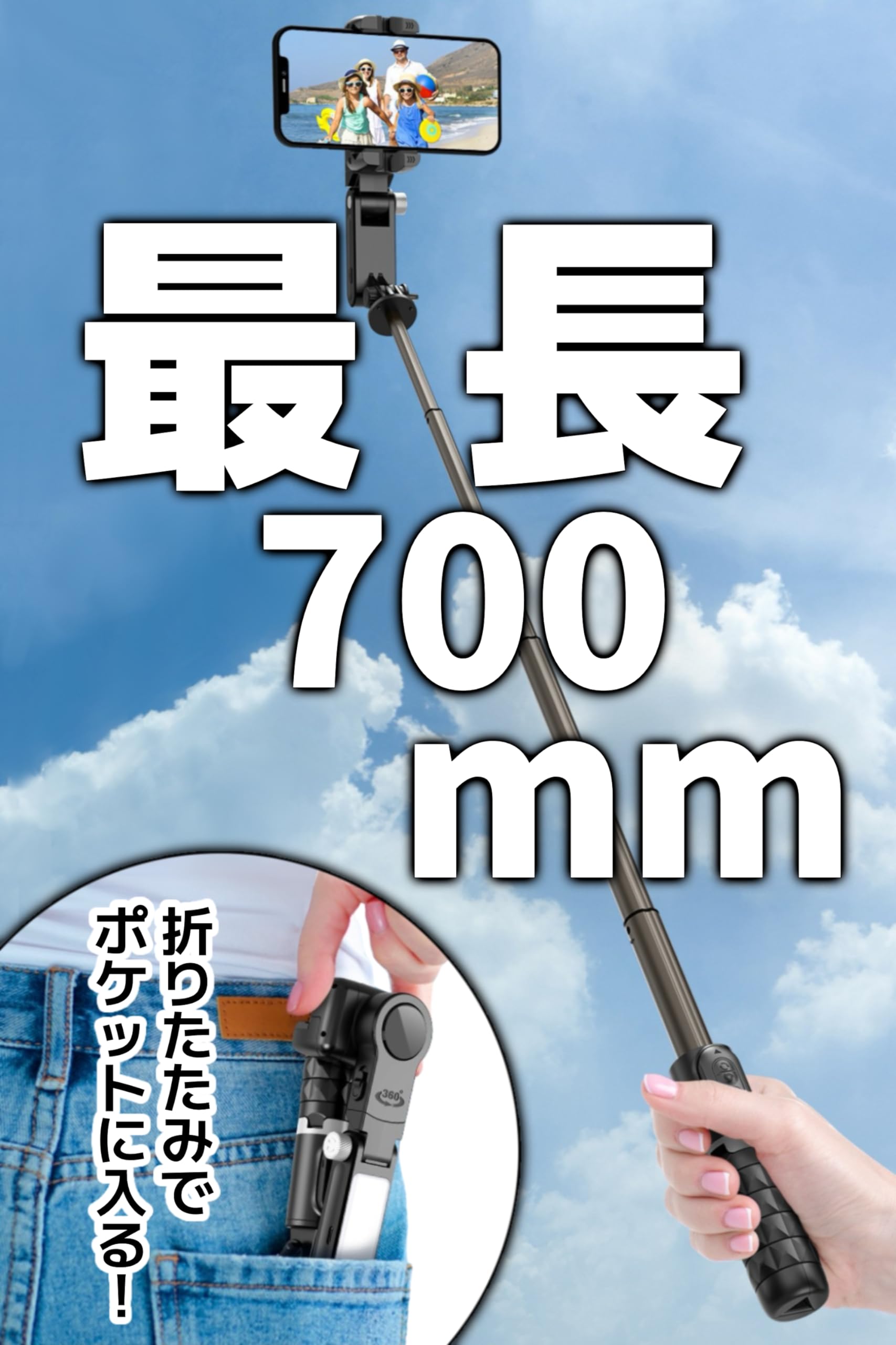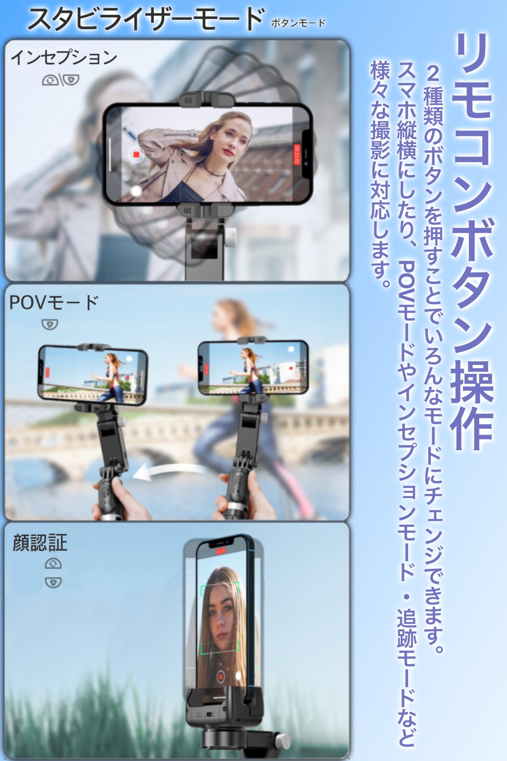 ジンバル、自撮り棒、三脚として使用できる3in1の写真、動画撮影用のスマホアクセサリーです。スマートフォンの固定方法は、前方だけでなく、上方(真上)からの撮影もでき、より臨場感のある今までにないカメラアングルから撮影することができます。