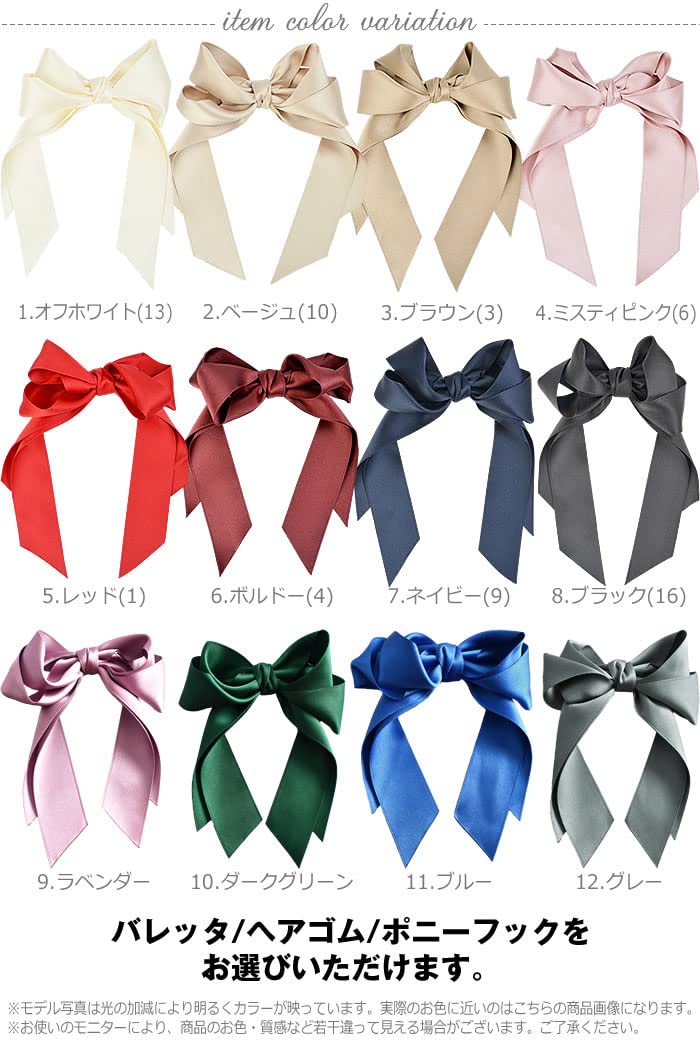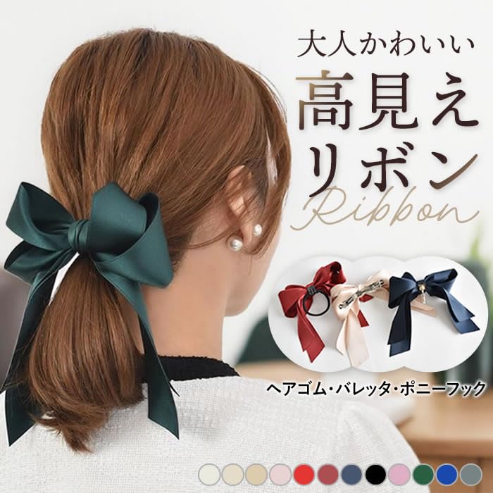 大きめサテンリボンが目を惹く上品なリボンヘアアクセサリー。ダブルリボンでボリューミーなので可愛く目立ちます。バレッタ・ヘアゴム・ポニーフックと3タイプをご用意。カラーは定番の白や赤など高見えする色を揃えました。大きめリボンで品のあるサテンリボンヘアクリップがフェミニンな女性にピッタリの髪留めです。デートや結婚式などのフォーマルにも使えるヘアリボンの髪飾り。大人だけでなく子供の発表会や卒園式などセレモニーや行事でも大活躍です。テロンとたれるリボンは女性らしい揺れを演出してくれます。大きめバレッタなので毛量が多くてもしっかりまとめられます。