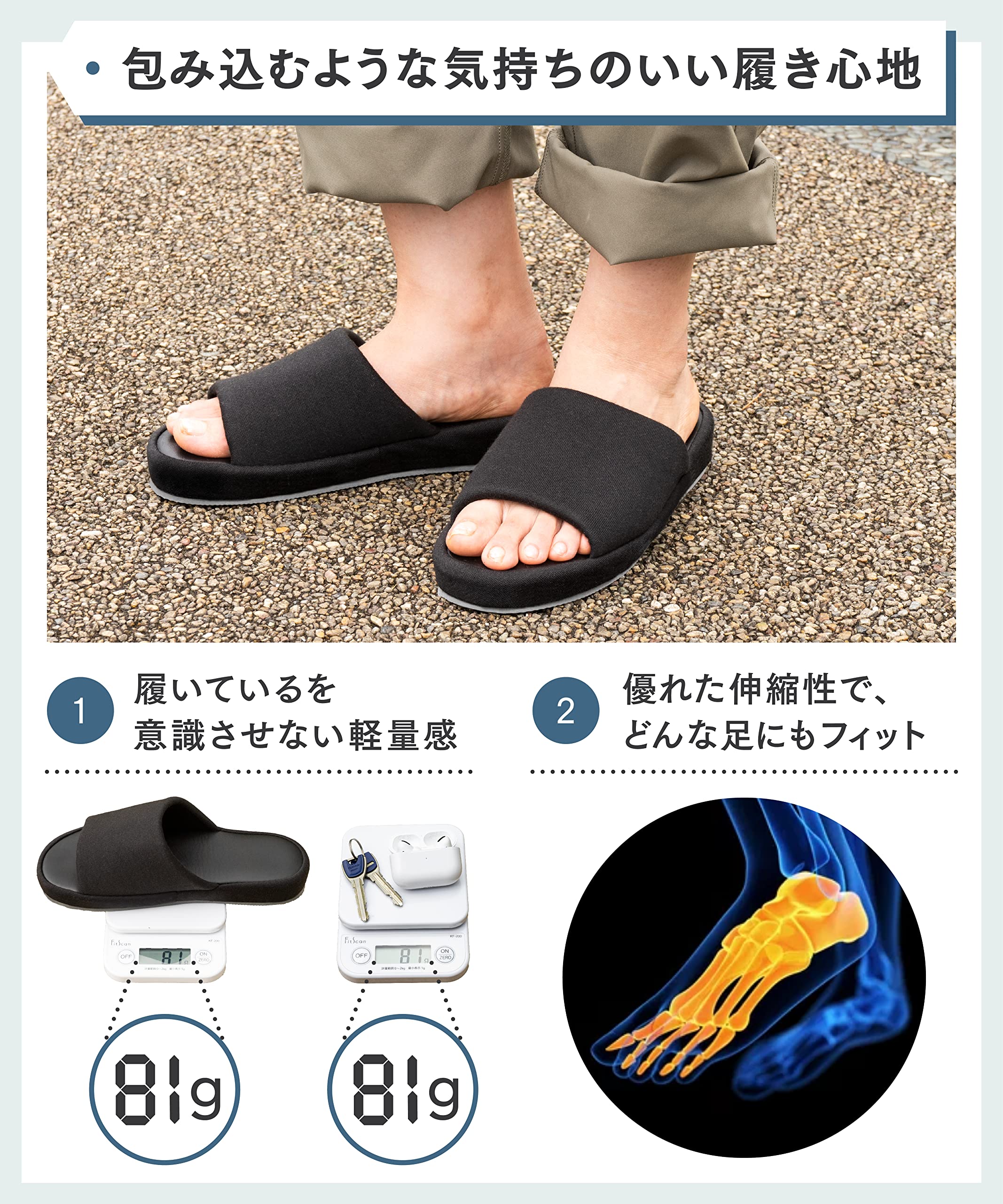 【超軽量】 履いていることを意識させない軽量感(片足81グラム)で疲労を軽減!