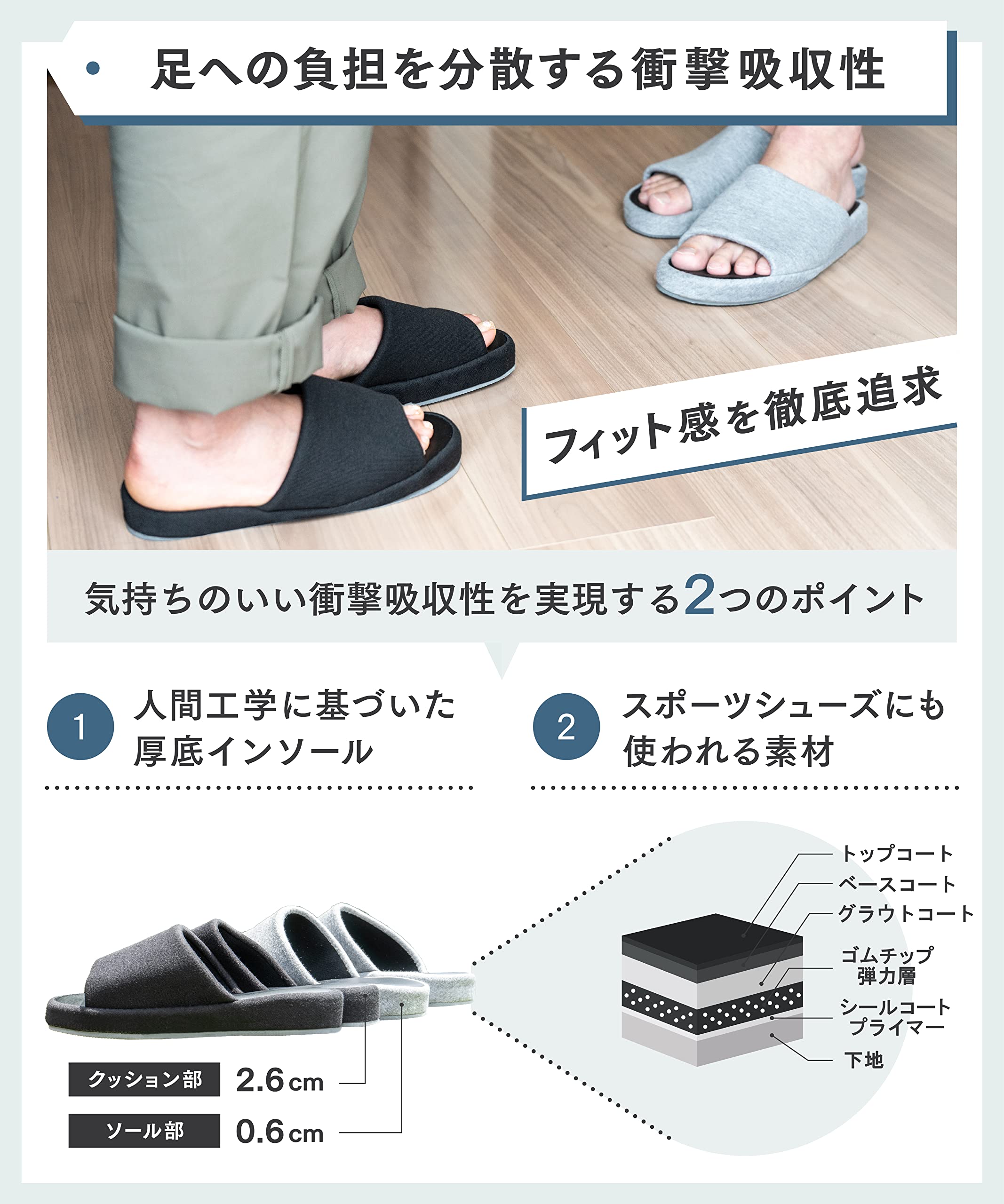【快適な履き心地】 クッション部分は衝撃を吸収して足の負担が軽減される適度な柔らかさの低反発素材を使用、試行錯誤を経て計算された厚底のソール設計によって衝撃吸収性を高めました。