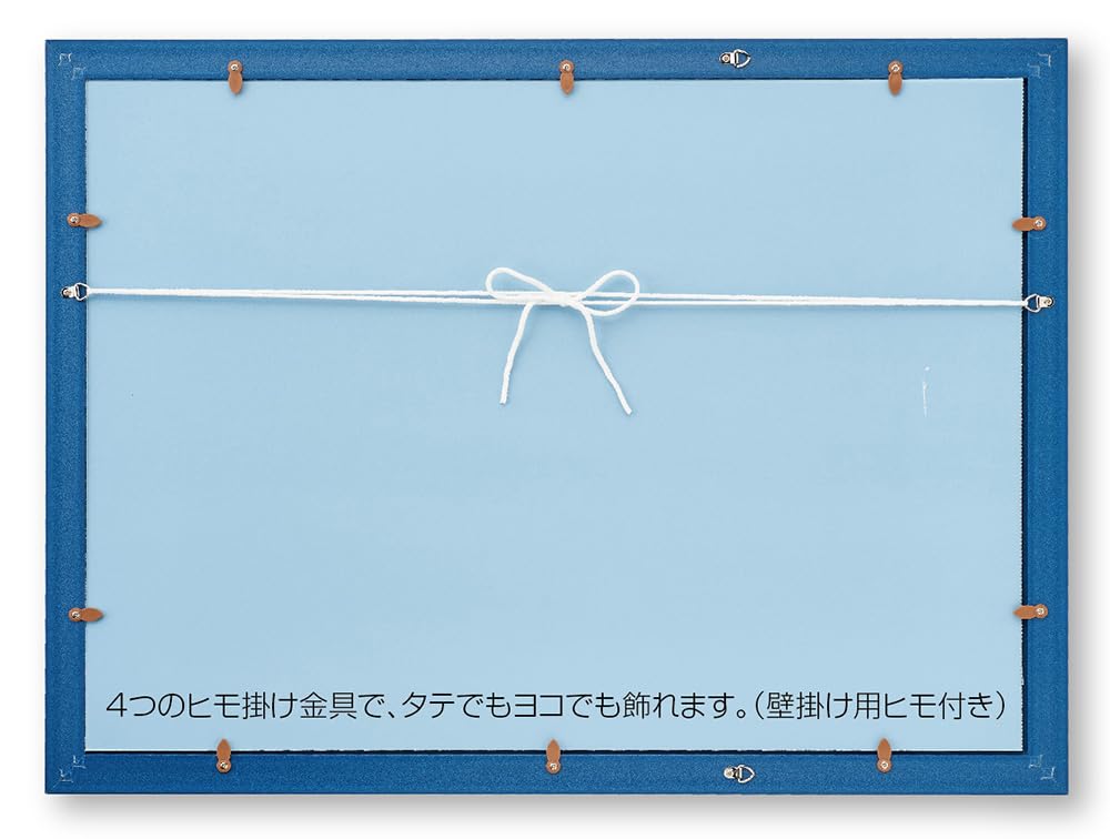 【4】セットが完了したら、絵柄のタテ・ヨコに合わせて、付属のヒモをヒモ掛け金具の穴に通し、ほどけないようにしっかり結びます。