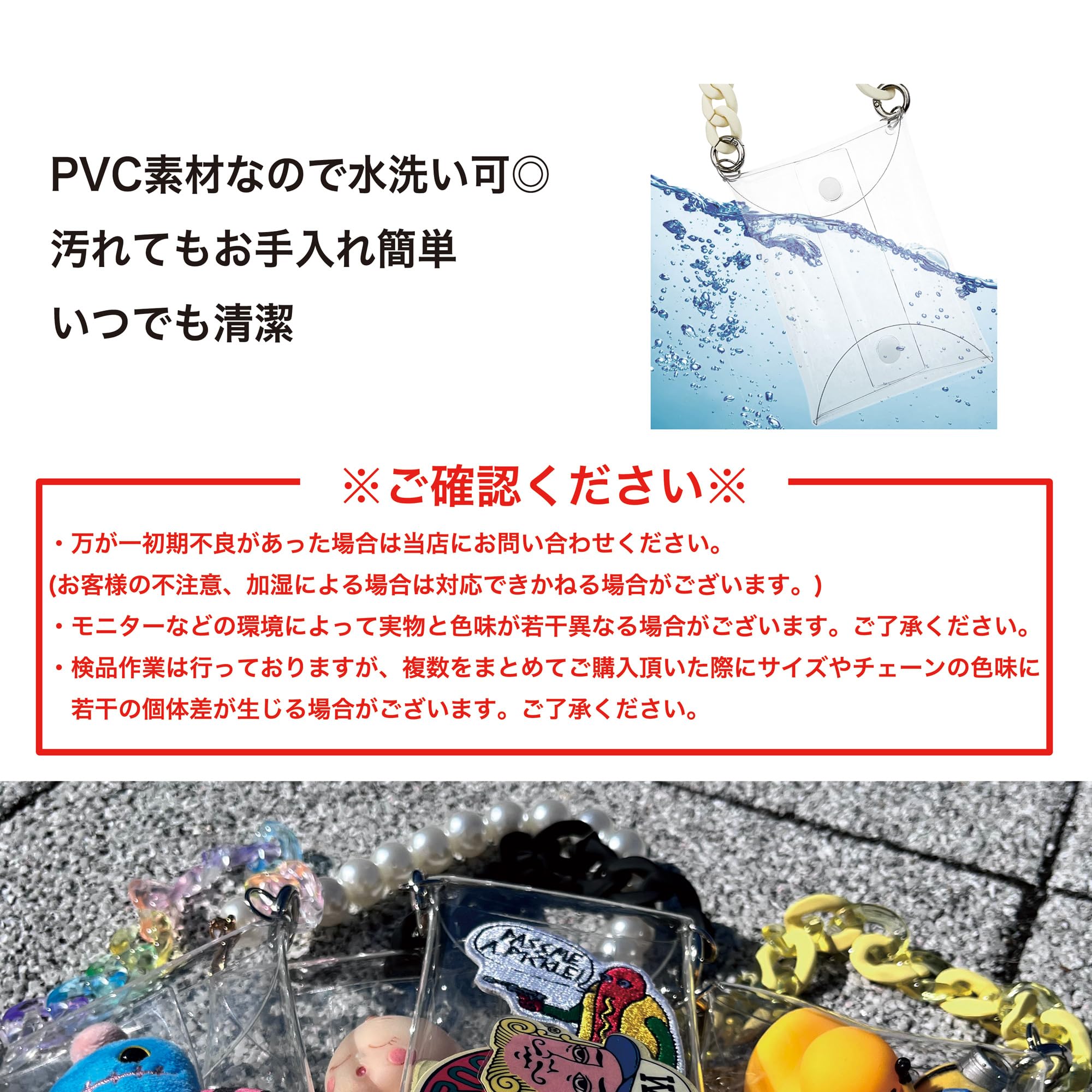 【サイズ】(約)縦11.5×横8cm 【重量】カラーチェーン(約)34g、パールチェーン(約)44g 【材質】PVC 【生産国】中国 【注意事項】※初期不良があった場合は当店にご連絡ください(お客様の不注意・過失の場合はご対応しかねる場合がありますことをご了承ください)※モニターによって色味が実物とやや異なる場合がございます。※生産工程上、微量なサイズ・重量の個体差がある場合がございます。ご了承ください。