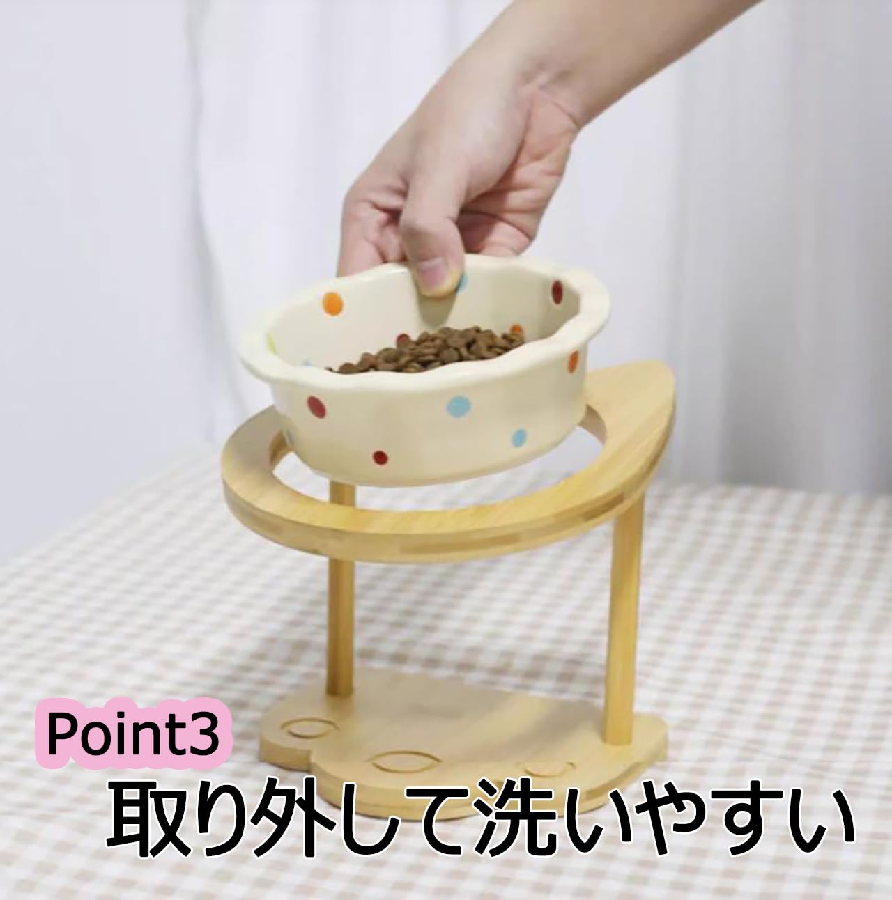 台座はワンちゃんネコちゃんが食べやすい適度な角度に設計されており、首を曲げすぎずにご飯を食べたりお水を飲んだりすることができ、ペットの体への負担を軽減します。