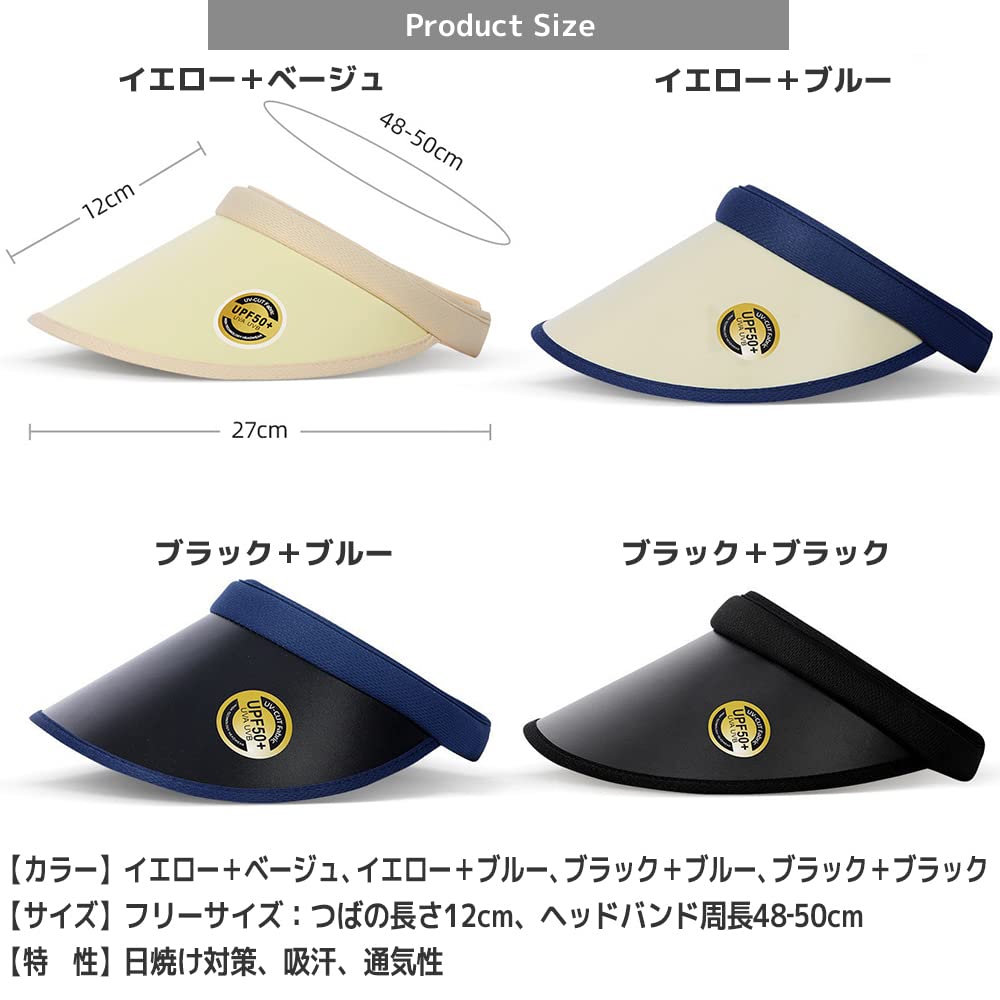 【カラー】イエロー+ベージュ、イエロー+ブルー、ブラック+ブルー、ブラック+ブラック【サイズ】フリーサイズ:つばの長さ12cm、ヘッドバンド周長48‐50cm【特性】日焼け対策、吸汗、通気性