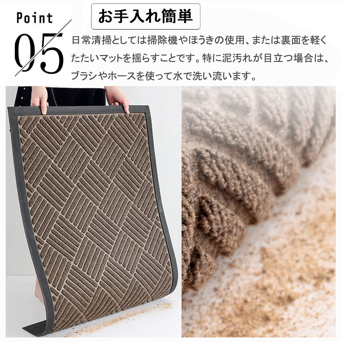 【お手入れ簡単】日常清掃としては掃除機やほうきの使用、もしくは裏面を軽くたたいマットを揺らすことで十分です。特に泥汚れが目立つ場合は、ブラシやホースを使って水で洗い流すのもよろしいです。