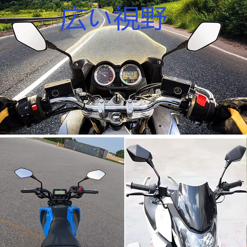 優れた品質:バックミラーは高衝撃ABSケース、純白ガラスレンズ、頑丈な11.5 mm鋼柄で作られている。8mm/10mm変換アダプタ5個と取り付けレンチを備え、防振性と耐食性があり、ほとんどのモデルに適合できる。