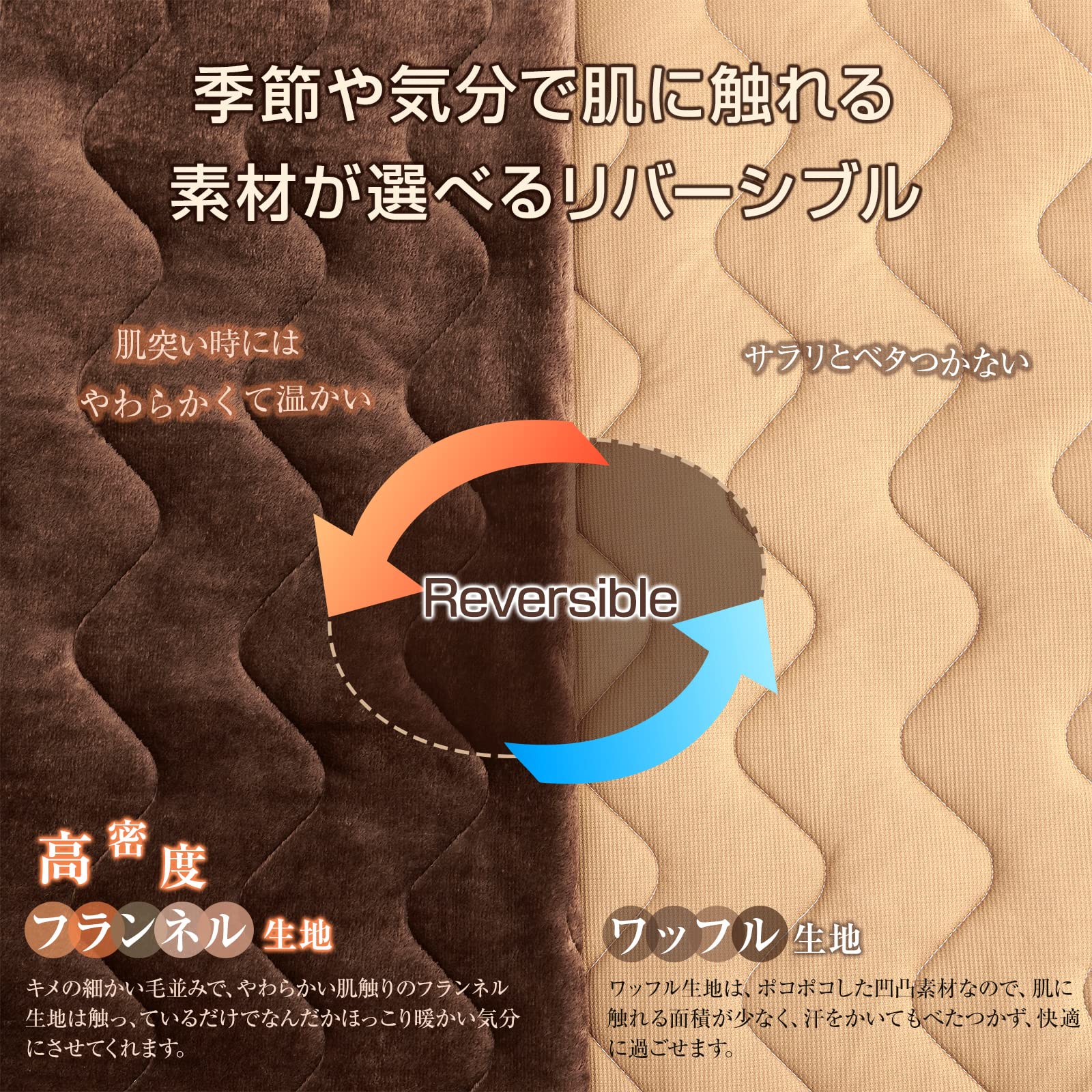 【素材・なめらかで極上の肌触り】[素材] 表面:高密度プレミアムフランネル生地、裏面:ワッフル生地、中綿:蓄熱綿(ポリエステル100%)敷きパッドは暖かさだけでなく、肌触りも追求。なめらかで気持ちの良いフランネル生地にすることで、睡眠の心地よさを向上させます。ふわっとした触感と暖かさが相まって、身体だけでなく心までぽかぽかにいたします。