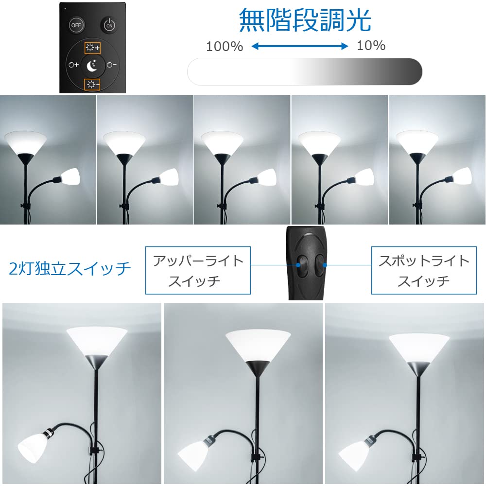 【リモコン制御・多機能】電源コード付きのスイッチカ「オン」の場合は、リモコンに正常に作動できます。リモコン操作を通じて、点灯消灯機能、メモリー機能、30分&60分自動消灯機能、無階段調色調光機能、常夜灯機能を実現できます。