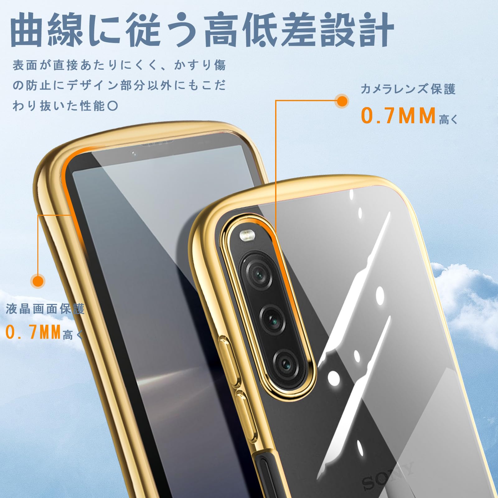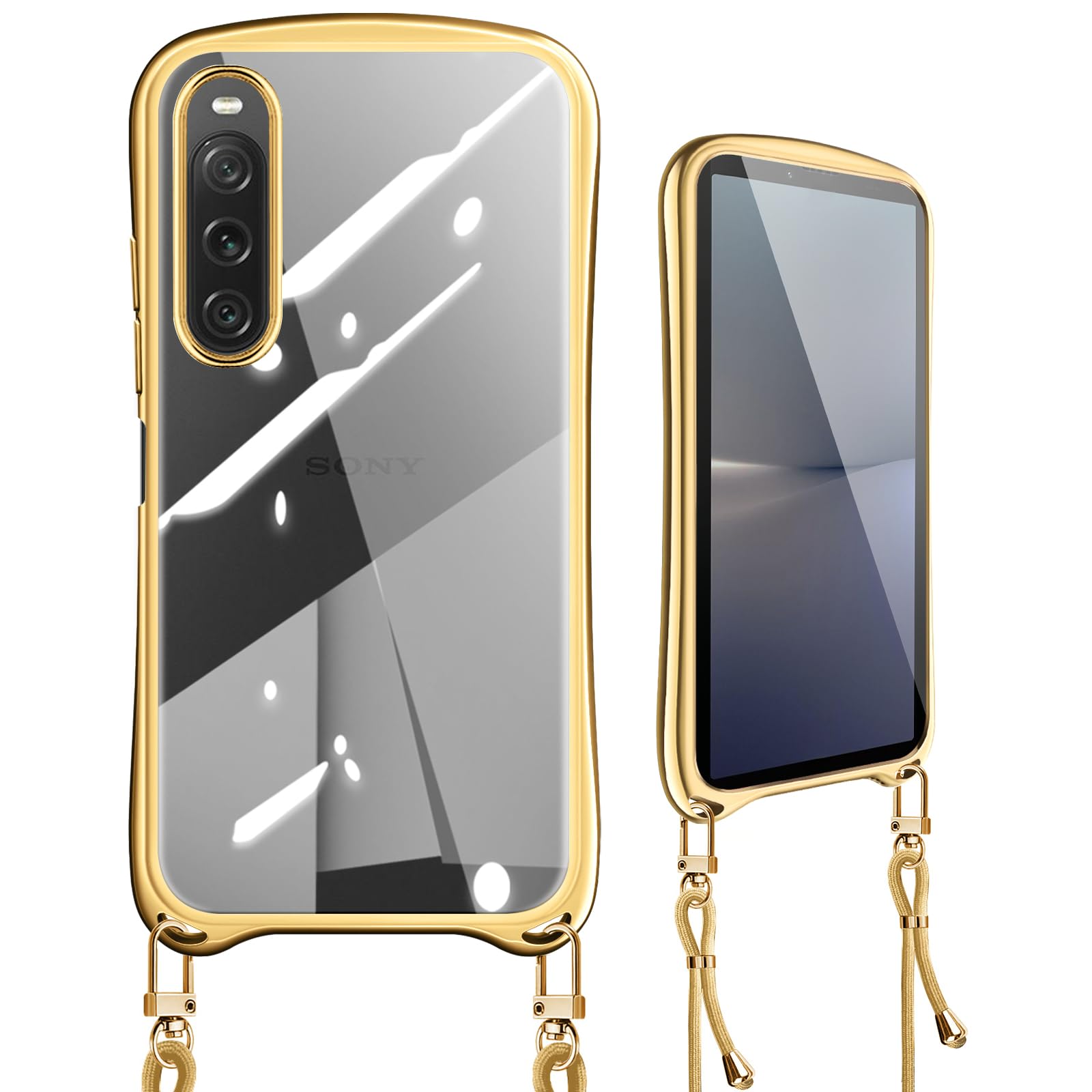 Xperia 10 V ケース クリア ショルダー Sony Xperia 10 V SO-52D カバー 肩掛け 首掛け SOG11 ストラップ付き 斜めかけ 縄掛け 紐付き 韓国 薄型 軽量 耐衝撃 シリコン TPU バンパー メッキ加工 ソニー エクスペリア 10 V スマホケース ゴールド