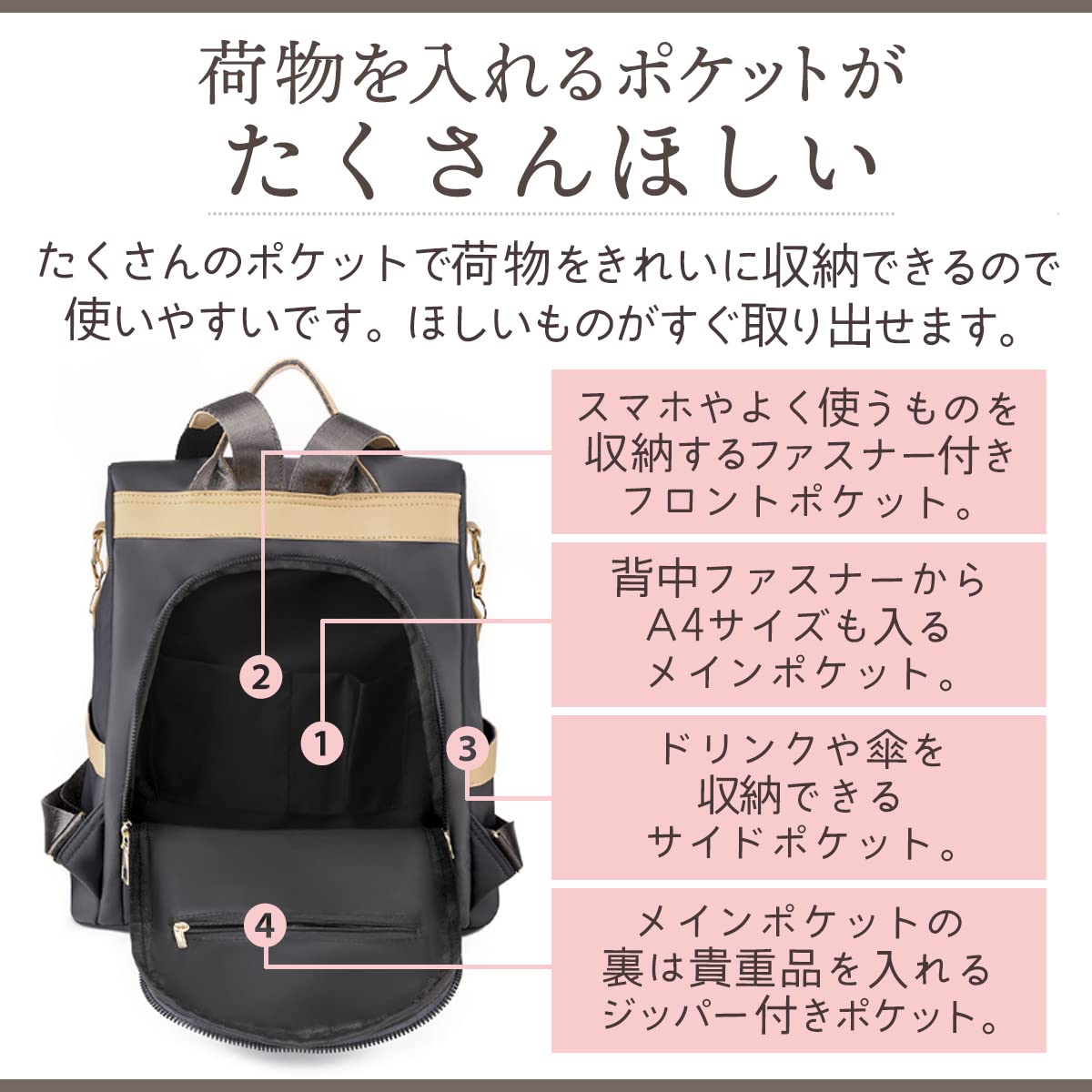 [InZaccaZ] リュック 防犯 3way レディース ショルダー ハンドバッグ 通勤 おでかけ 旅行 軽量 A4サイズ おしゃれ きれいめ 大人可愛い