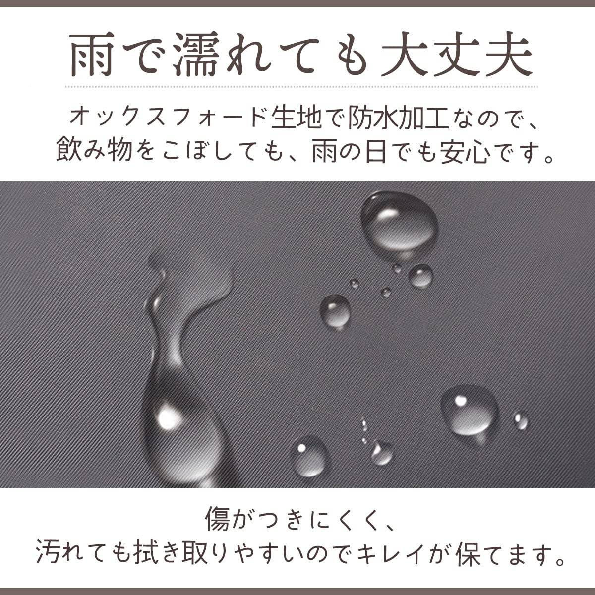 ・オックスフォード生地で防水加工なので、飲み物をこぼしても、雨の日でも安心です。傷につきにくく、汚れても拭き取りやすいのでキレイが保てます。