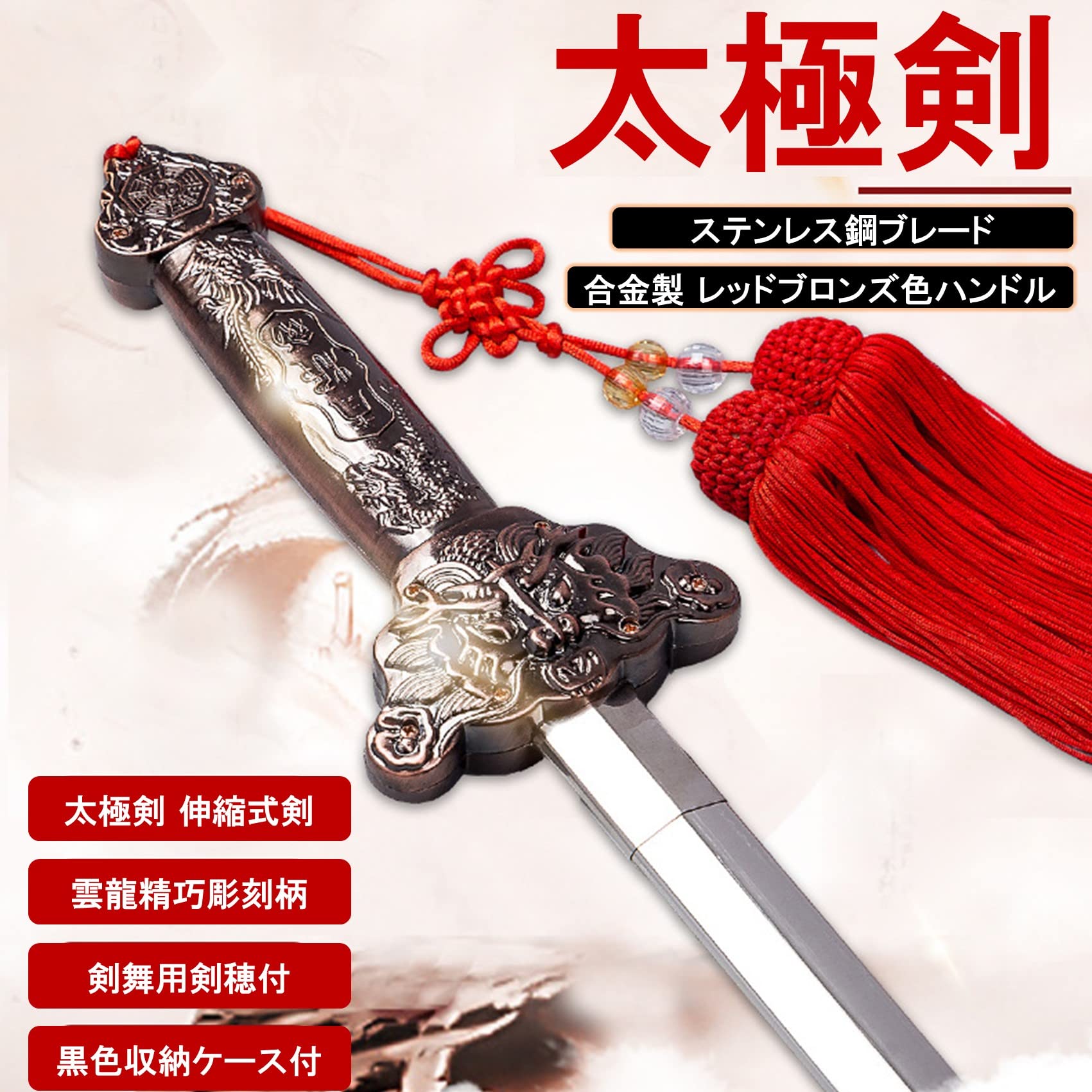 ブレードはステンレス鋼素材を使用し本格的で重厚感があり防錆性、耐久性に優れています。伸縮式で伸長時は90cm、収縮時は25cmのサイズとなります。ハンドルには縁起の良い雲龍柄の彫刻をデザインし、合金製、レッドブロンズ色で高級感があり剣舞を引き立てます。