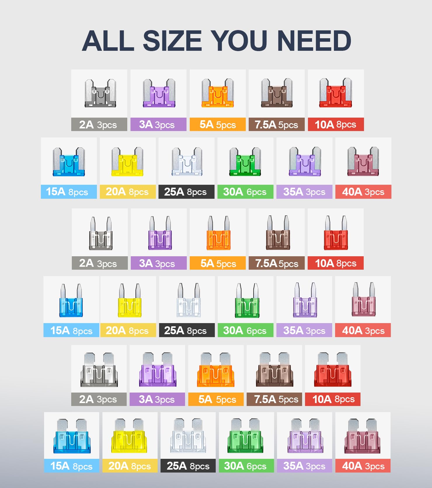 【高品質、識別しやすい】-ヒューズは環境にやさしいプラスチックと亜鉛合金で作られています。各電流仕様のヒューズは異なる色で区別され、現在の仕様番号は各ヒューズの上部にマークされており、簡単に識別できます。