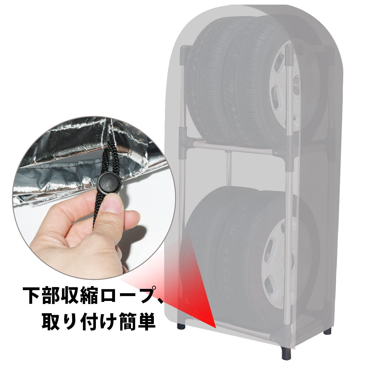 【優れる防水性】内側表面にはポリウレタン塗料と紫外線防止保護塗料を塗る工芸で、ポリウレタン塗料なら撥水性、防水性が優れる、内側の生地も柔らかくになる、着脱時の傷が最小限に抑えられる、紫外線防止保護塗料なら、タイヤラックを紫外線から守ってくれる効果がある。【掃除やすい】 水ですすぎ、乾いたタオルで乾かすだけできれいになります。 【風飛び防止デザイン】有効的に風飛びを防止するように、カバーの底部は絞る紐が付きます、ごニードによって調整してください脱着も簡単にできますし。
