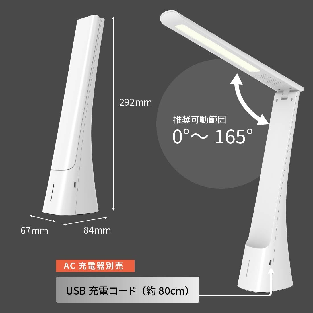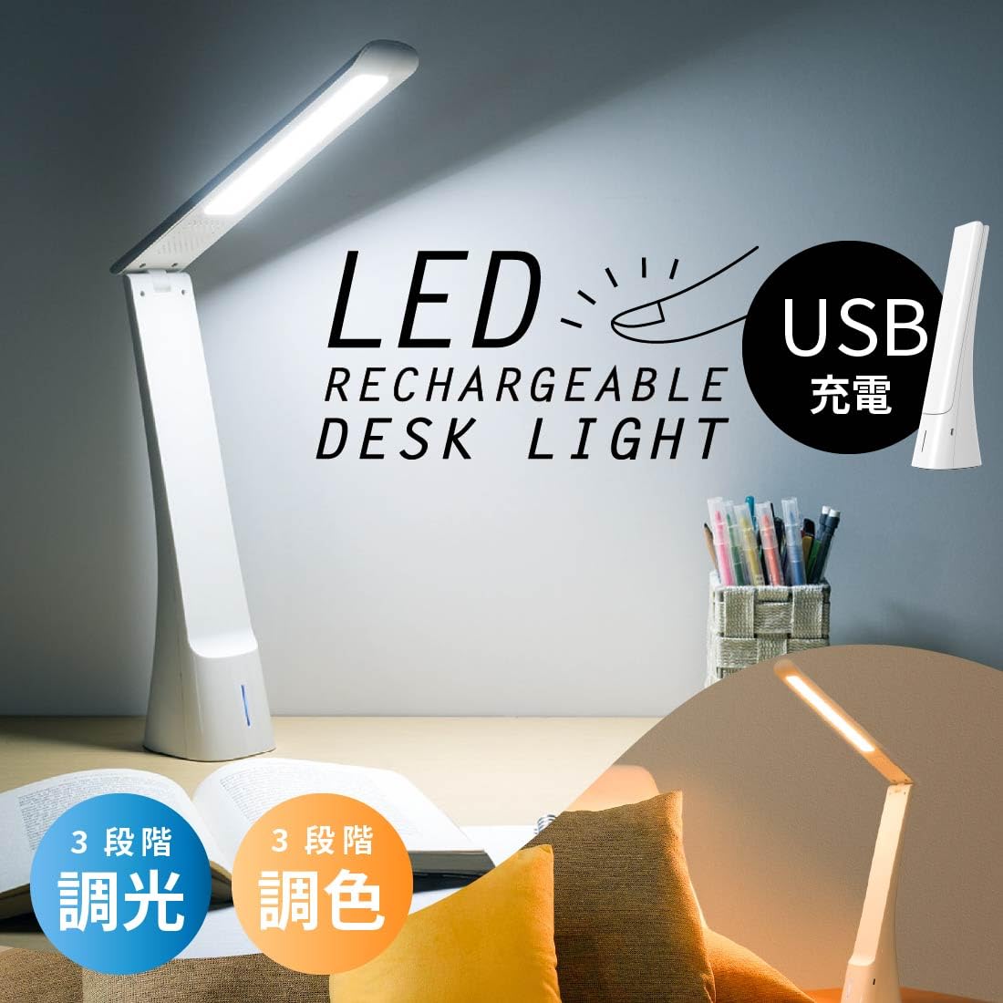【 特 長 】 ◆3段階調光と3段階調色の組み合わせで用途に合わせて選べる9つの点灯モード ◆タッチセンサーで明るさと光色を切り換えできます ◆1秒タッチで3段階調光、2秒タッチで3段階調色 ◆目に優しい設計 ◆USB充電式、リン酸鉄リチウムイオン電池採用 ◆本体カラーはホワイト