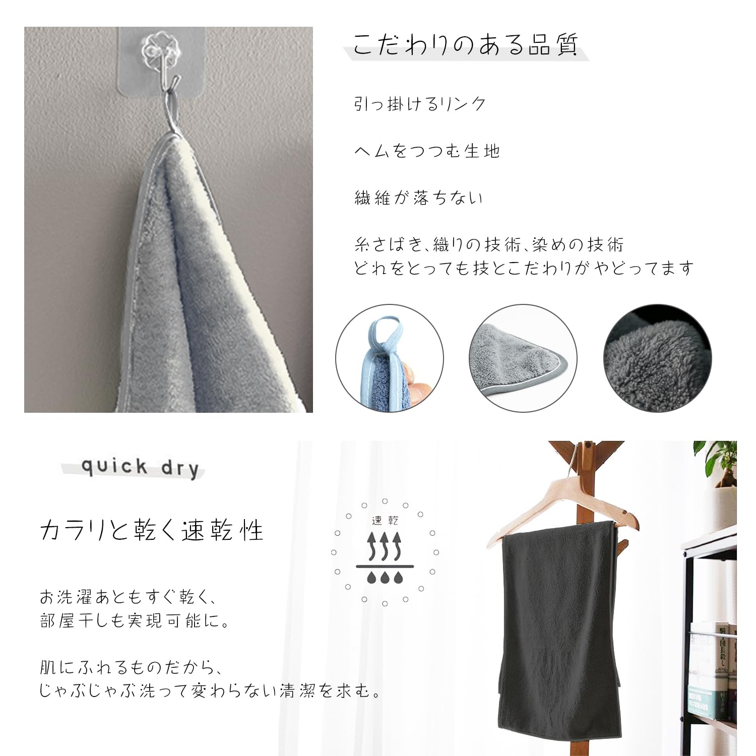 【乾きやすくてお洗濯が楽!高品質のタオルをお届けします】 じゃんじゃん使える!業務用にも強化を加えた特製タオル。乾きが速くて、丈夫でお洗濯もコンパクト。いくら絞っても形は崩れないしほつれ防止のためヘムの周りはしっかりと縫い合わせています。独特の吊り輪付き、引っ掛けやすい収納便利。長くご愛用いただけるよう、フェイスタオル周りを丁寧に加工しています。また、有害物質を含まない天然染料を使用しています。何度洗っても色落ちや抜け毛がない