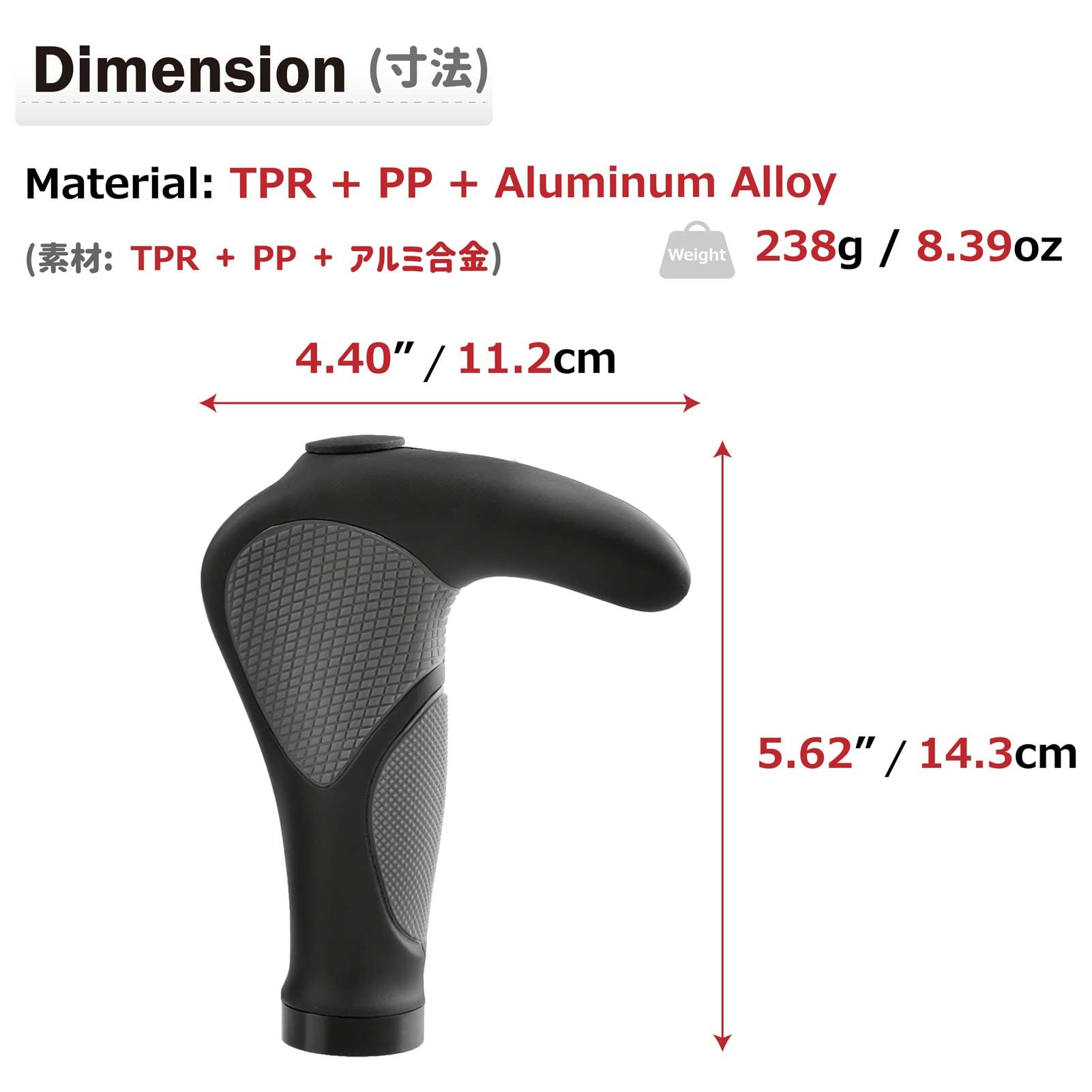 【製品寸法】補助ハンドルバーの取り付けチューブ径は22.2mmです。2つのサイズを揃えています(全長×エンド幅):141 × 69(mm)、231g;143 × 112(mm)、238g