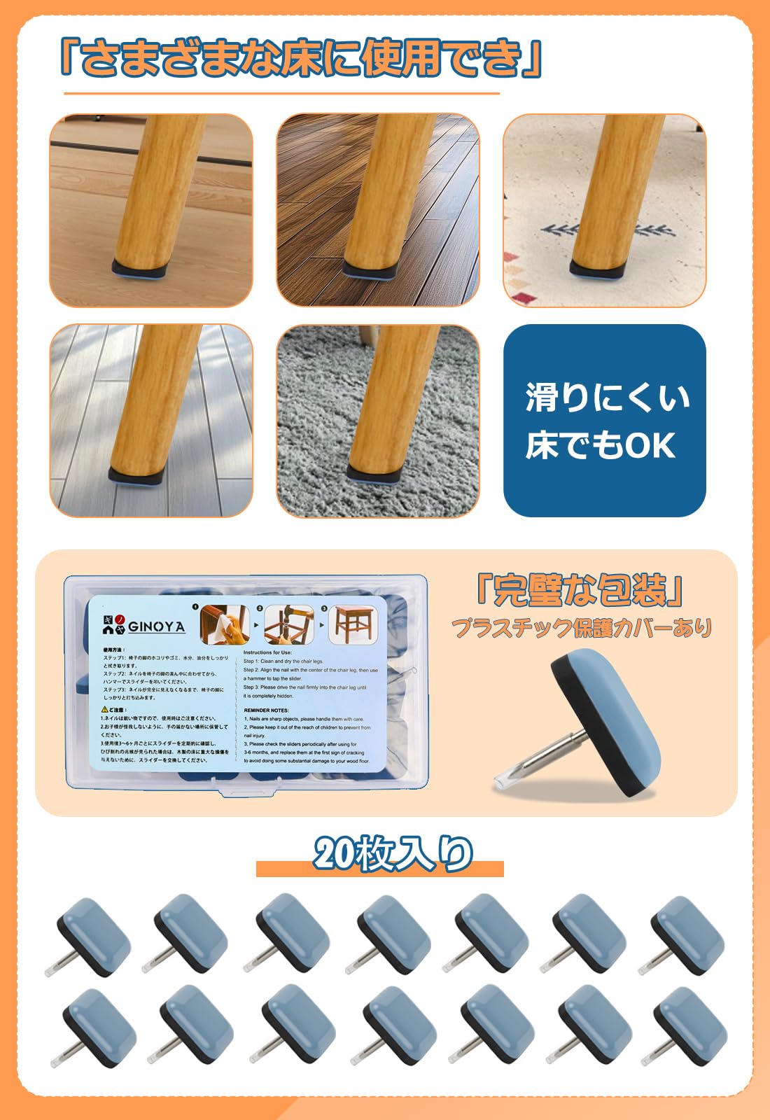 ギノヤ 家具スライダー 20枚入り 25mm 方形 家具移動パッド ネイル付き 楽々移動 キズ防止・防音