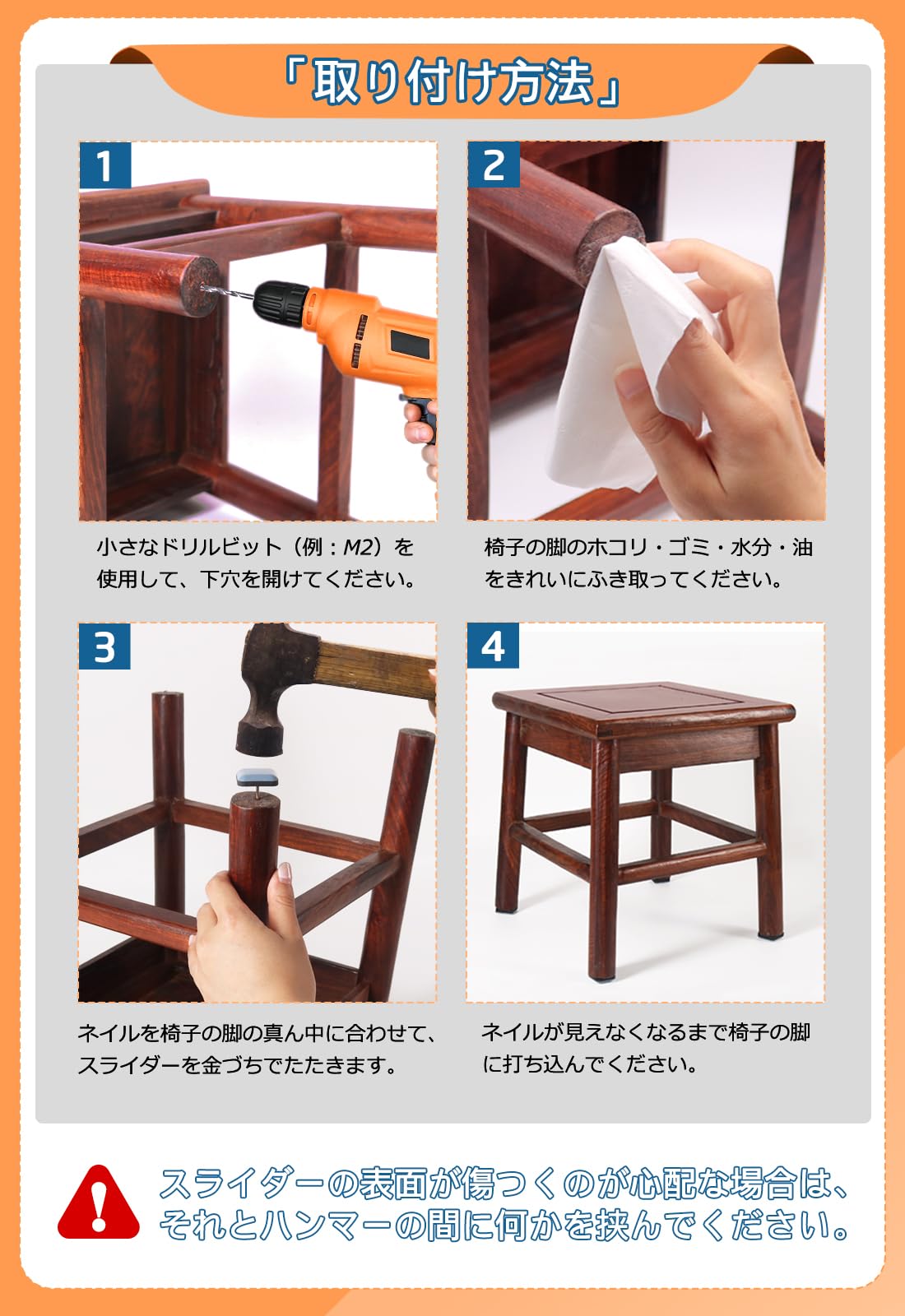 高品質・再利用可能すべり面はPTFEを採用して作られた家具スライダーは耐高温性や耐食性がよいです。ネイル式で脱着した後ほかのところで使用しても大丈夫です。