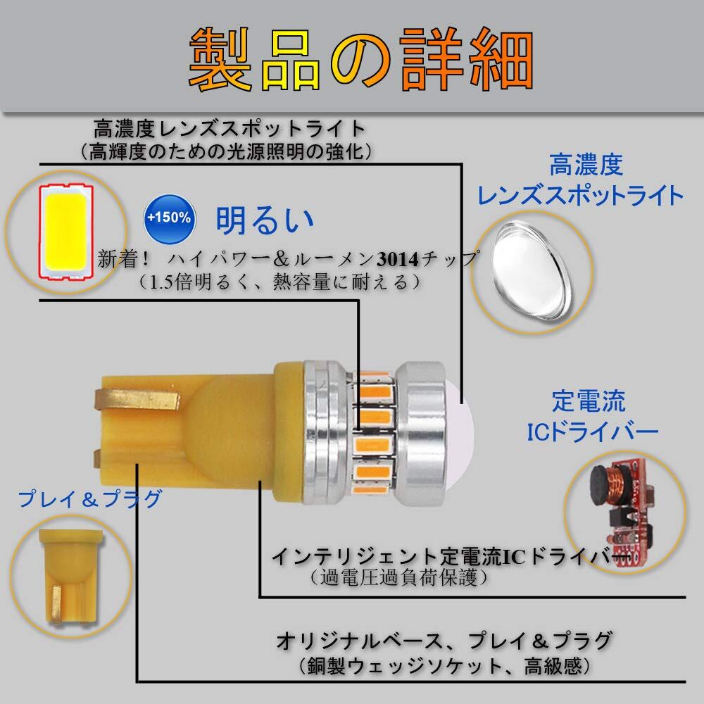 【規格】T10 W5W 175 194 12961 2825 LEDバルブ SMD3014 20連ハイパワーチップ搭載;ベース:アンバー