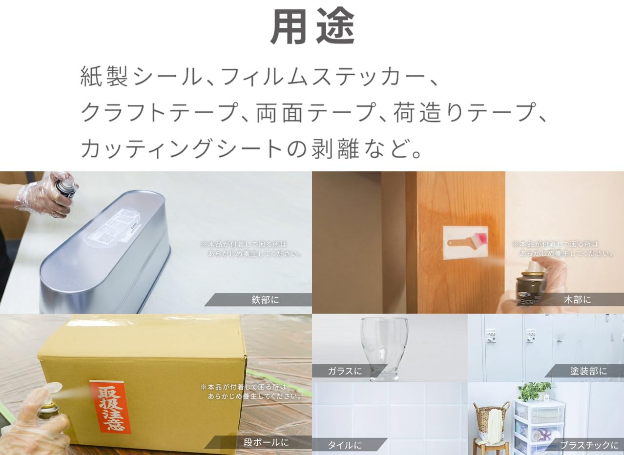 用途:●紙製シール、フィルムステッカー、クラフトテープ、セロハンテープ、両面テープ、荷造りテープ、カッティングシート等をはがす時に。●粘着剤のベトつき除去に。