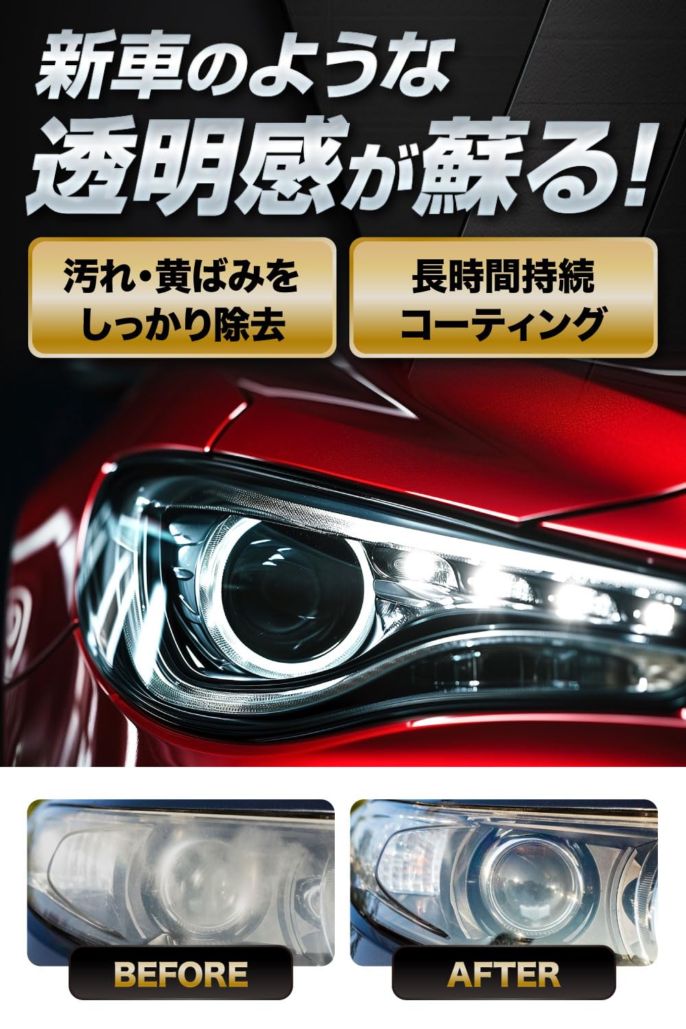ヘッドライトの黄ばみ・くすみを簡単に除去できる専用クリーナーと汚れにくくするコーティング剤がセットになっているのでいつまでも綺麗な状態が続きます。
