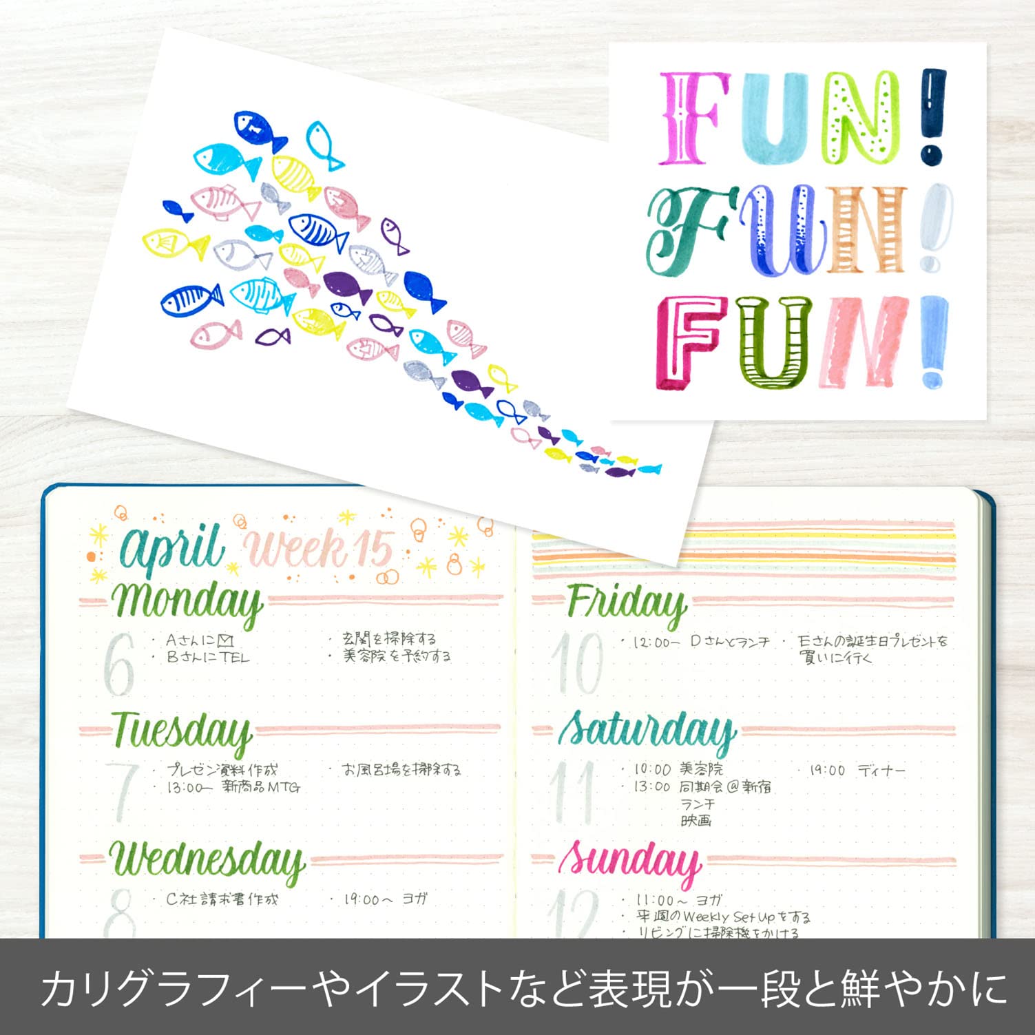 【特長】しなやかなペン先で筆のようなタッチが楽しめるカラーペン