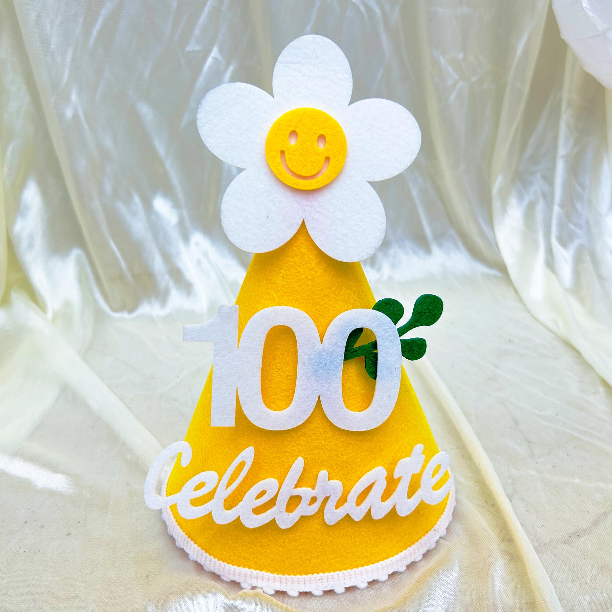 特徴 フェルト布ガーランド、デイジーバルーン、数字バルーン[100]、三角帽子