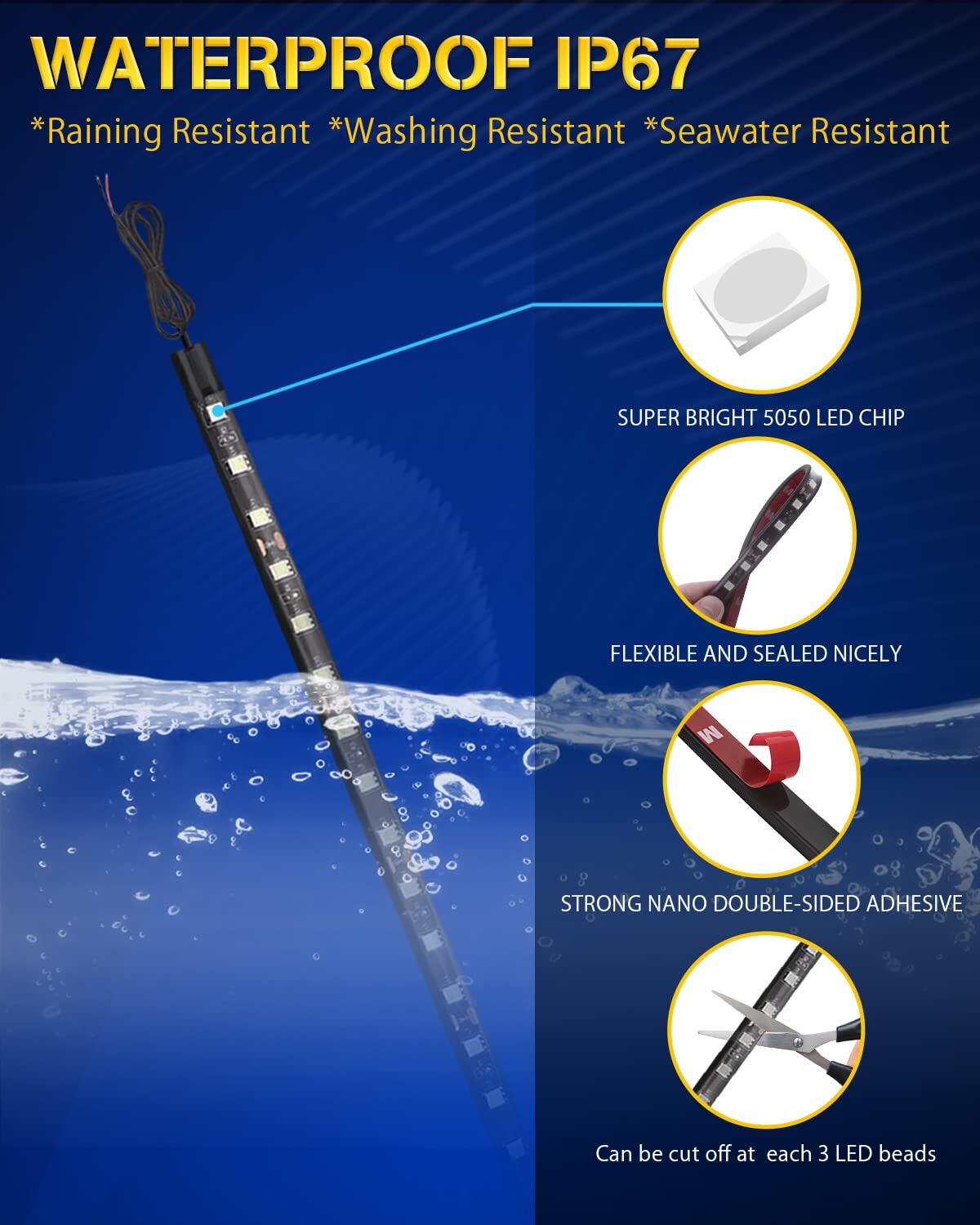 【高品質ABS材料&LEDチップ】車用LEDテープライトは高品質のABS材料と5050SMD LEDチップで作られ、きれいにシリコーンで密封され、DC 12V電圧に適用し、長寿命>50,000時間、それが長い時間を働いてもあまりにも暑くなることはない。点灯不良の可能性を大幅に減少させます。