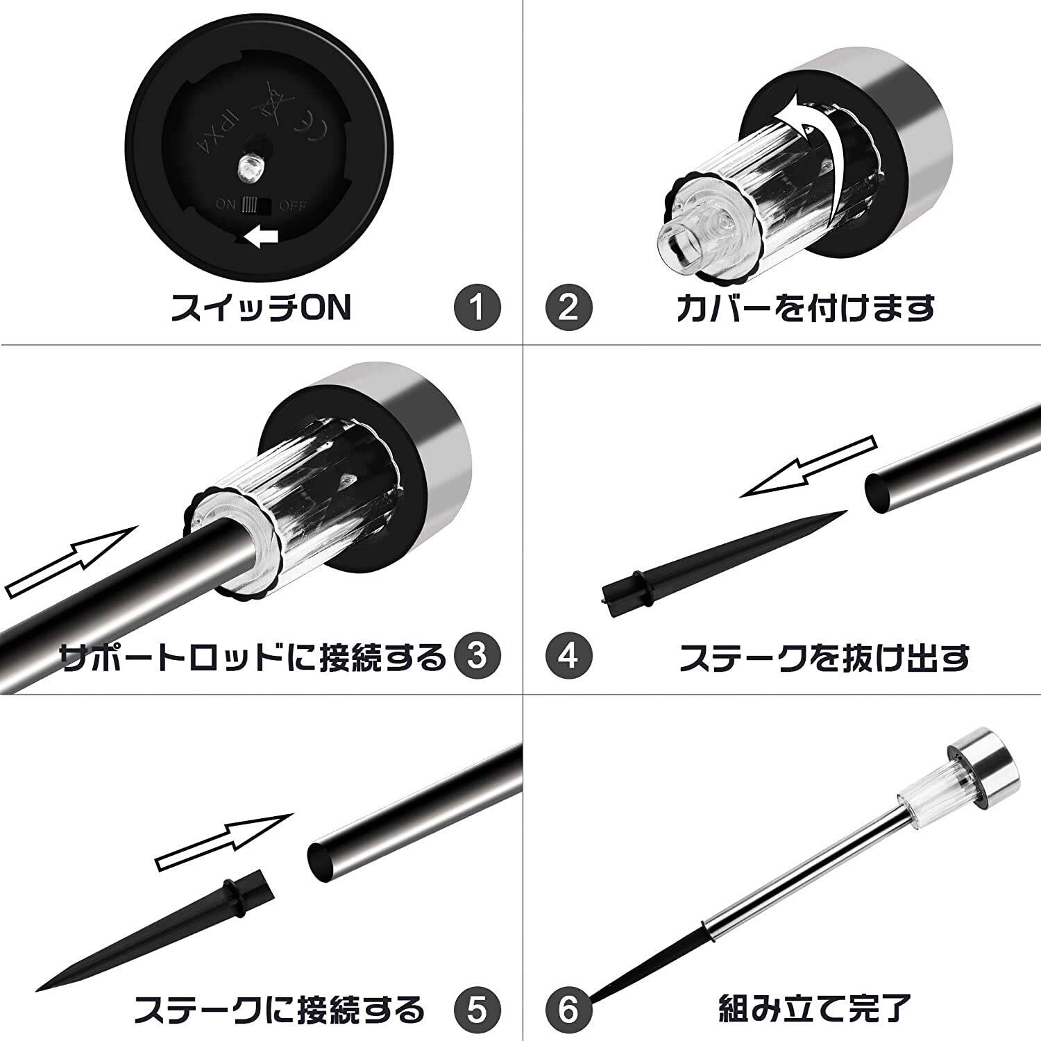 【取付簡単】配線無し、電池いらずで設置できるのも手間いらないです。各部を組み立てたら地面にガーデンライトを差し込むだけでOK。