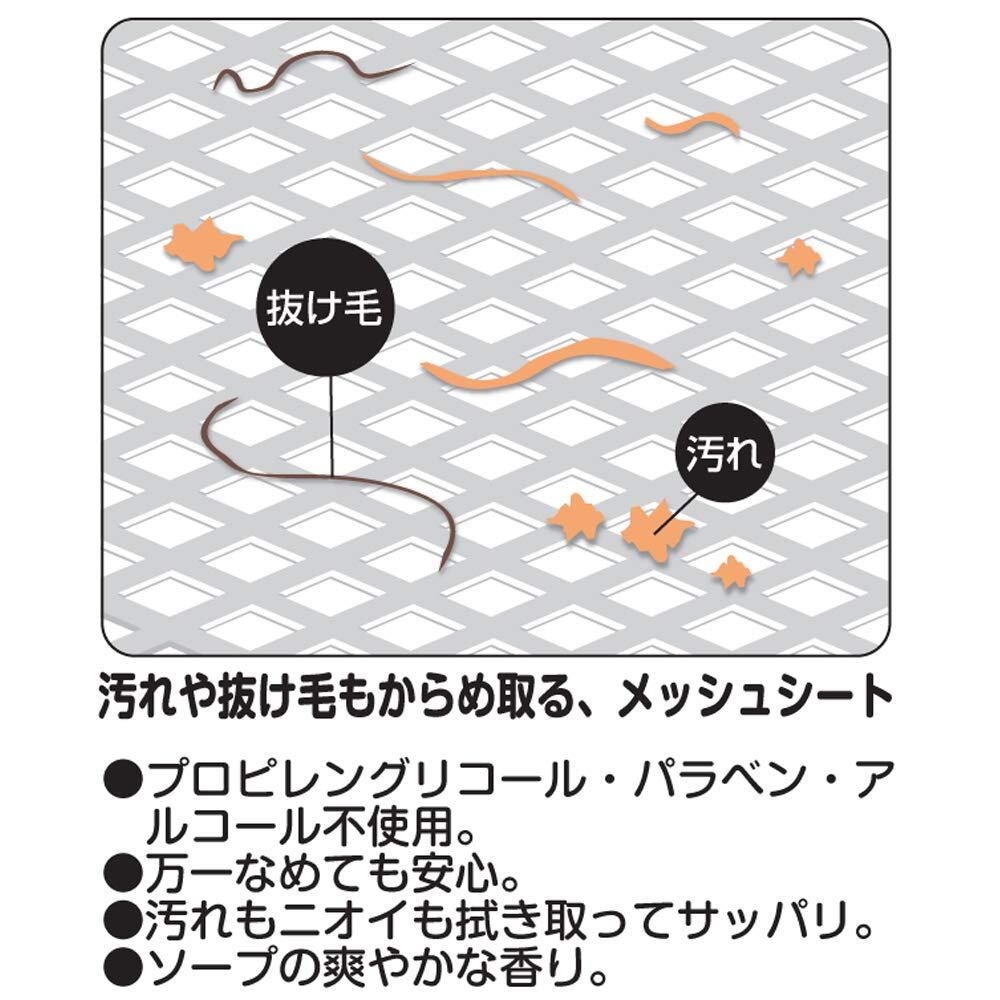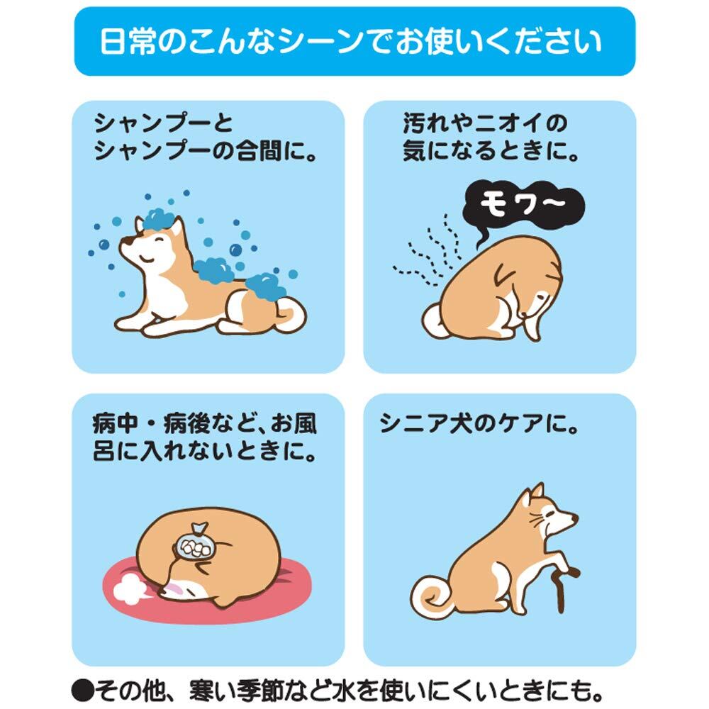 ・水を使わず拭き取るだけでシャンプーしたようにスッキリ! とてもやさしい使い心地で、毎日使える。・乾きにくい! 破れにくい! 超厚手、水分たっぷりのメッシュシート。・ソープの爽やかな香り。・ペット専用設計:プロピレングリコール、パラベン、アルコールすべて不使用(なめても安心)、竹乾留エキス配合。うるおい成分グリセロール配合。・シャンプーとシャンプーの合間、汚れやニオイの気になるとき、病中・病後などお風呂に入れないとき、シニア犬のケアなどにお使いください。