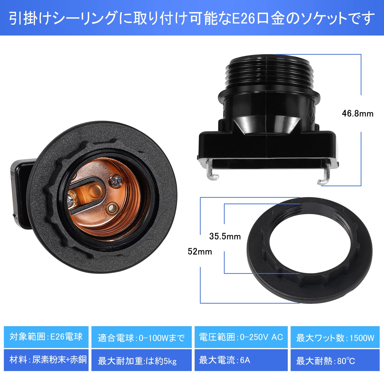 1.引掛けシーリングに取り付け可能なE26口金のソケットです、包装:2個入り、色:黒い、サイズ(CM):高さ4.4×幅2.4×全長5.2、材質:尿素粉末+赤銅、本体重量:40g/1個。